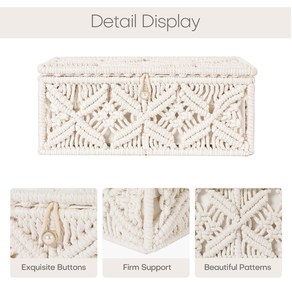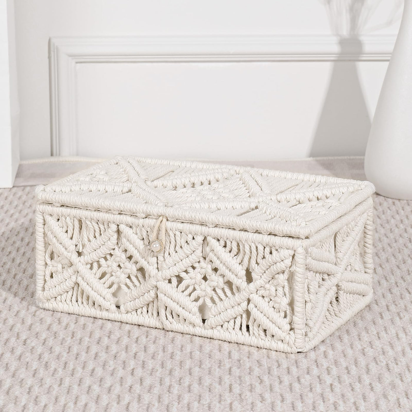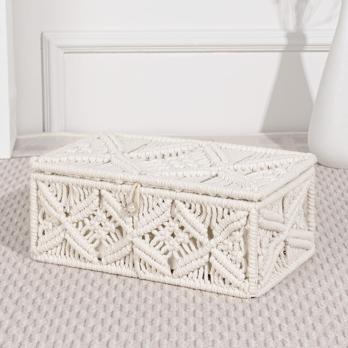 Q: Is the storage basket suitable for organizing jewelry?A: Yes, the ANMINY Macrame Storage Basket is ideal for organizing delicate jewelry, thanks to its secure lid design that keeps items protected and dust-free.