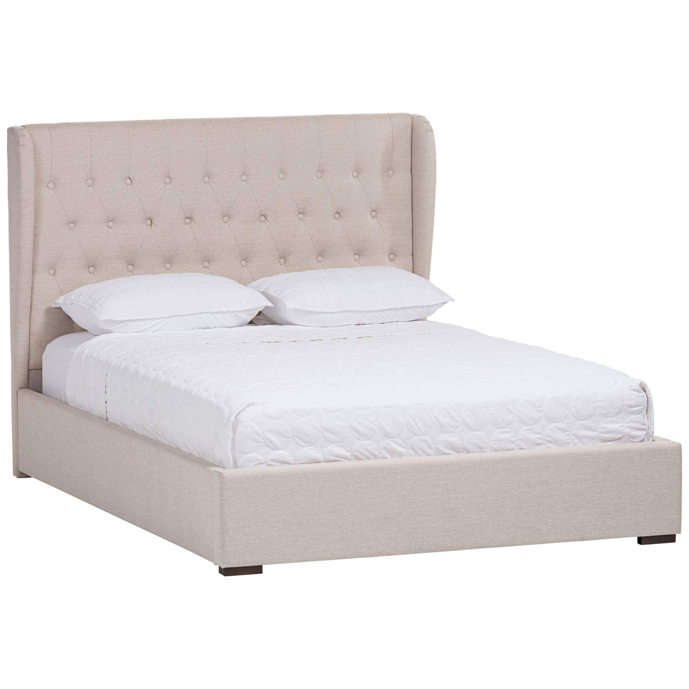 Covered with 100 percent light beige polyester upholstery, this Penelope queen wing storage platform bed by Baxton Studio is attractive and charming. The hand-crafted button tufted detailing on the headboard is distinct and eye-catching. The graceful curved wings on the headboard demand attention in the design of this bed.