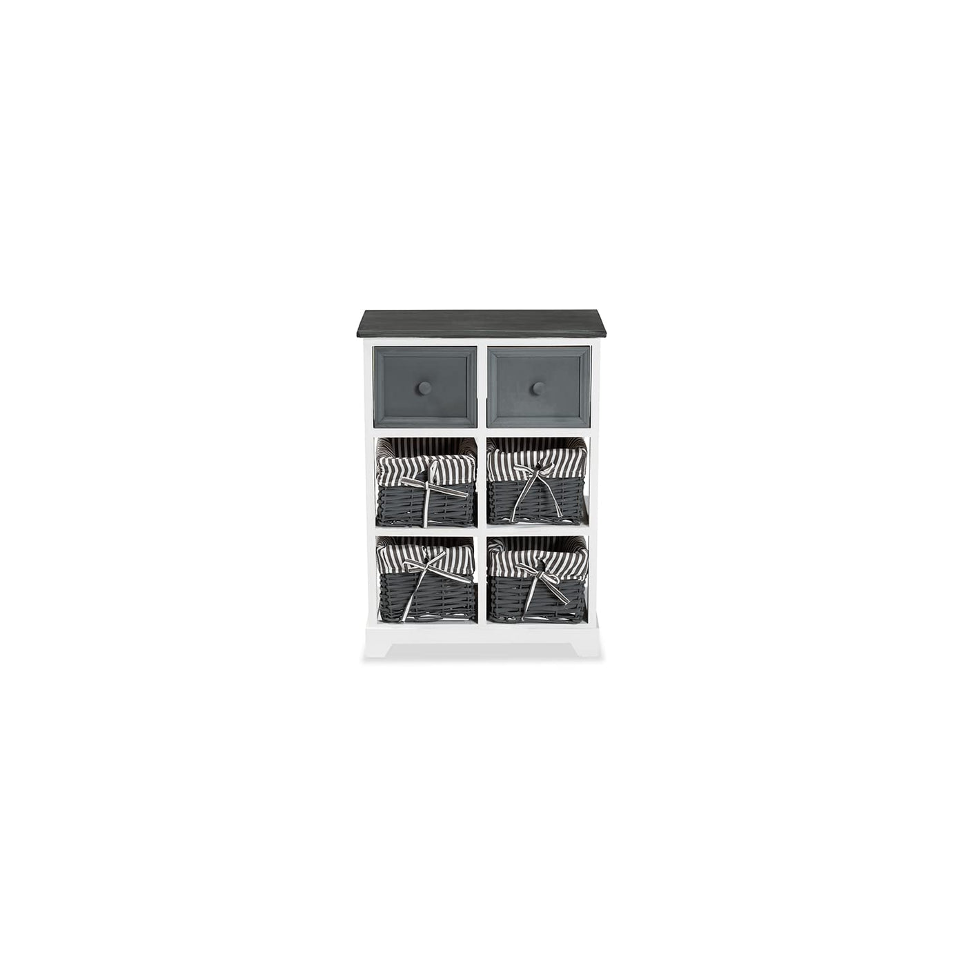 Build a sophisticated arrangement in your home with the sleek style and versatility of the Premala storage unit. Made in China, this unit is comprised of a lightweight wood frame fitted with woven baskets. Two drawers and four baskets provide exceptional storage space to help organize a living room, hallway, or entryway depending on your needs. Comes fully assembled, the Premala showcases excellent wood craftmanship with inset paneling and rounded drawer knobs. A fantastic blend of contemporary style and convenience, the Premala storage unit enriches any space.FeaturesInset panelingConstructed from paulownia, plywood & MDFTwo (2) DrawersFour (4) basketsWoven willow basket with fabric linerMaterial: Paulownia & Plywood & MDF, WillowColor: Grey, WhiteOverall Dimensions: 25.60' High x 18.70' Wide x 10.20' DeepDrawer Dimensions: 7.75' Wide x 7.25' Deep x 5.75' HighBasket Dimensions: 7.50' Wide x 6.75' Deep x 5.25' HighLegs: 2.00' High;Assembly Required: YesMade In China