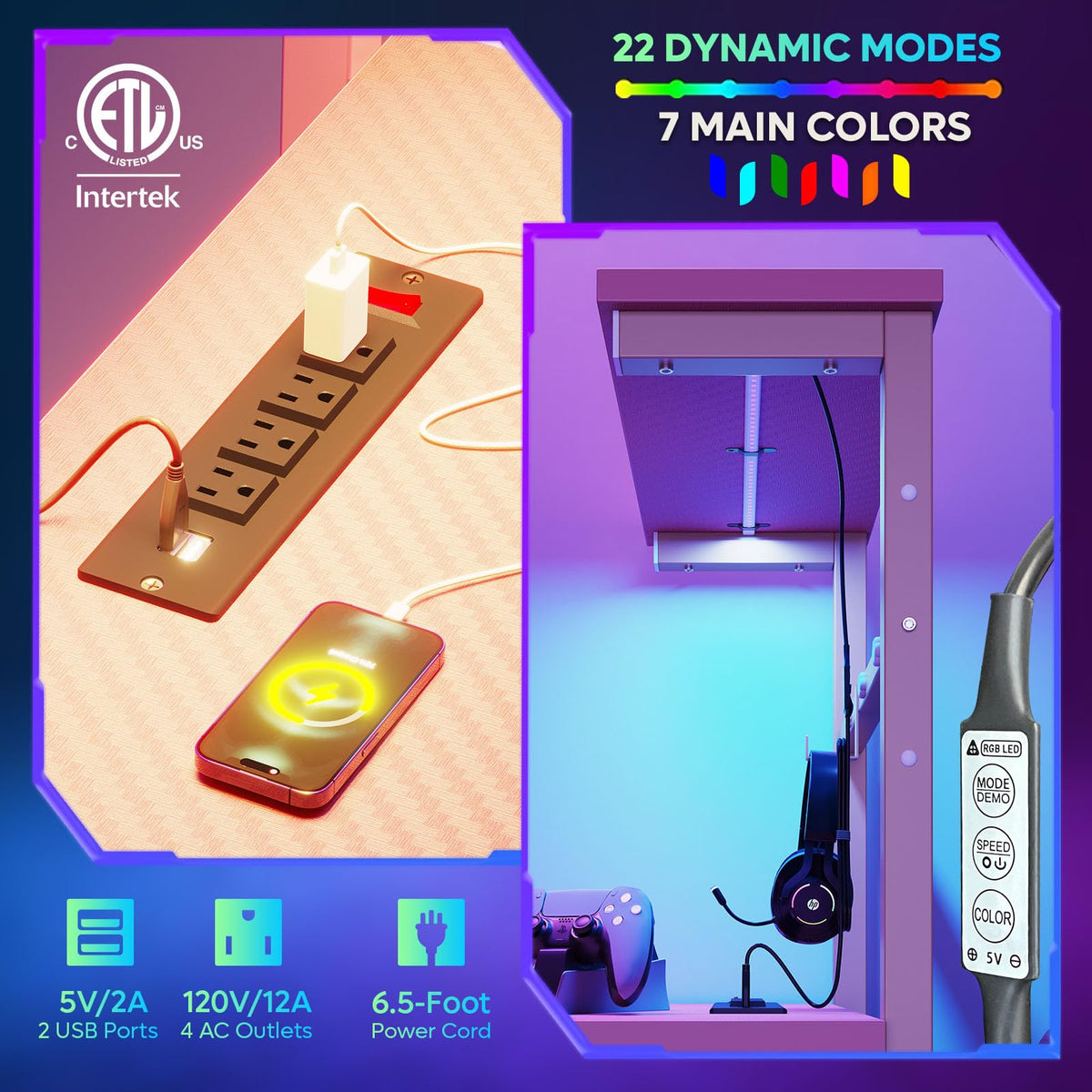 Bestier Pink Gaming Desk With Power Outlets, 44 Inch Led Gamer Desk With 4 Tiers Reversible Shelves, Pink Computer Desk With Headset Hook & Side Storage Bag For Bedroom (Pink 3D Carbon Fiber)