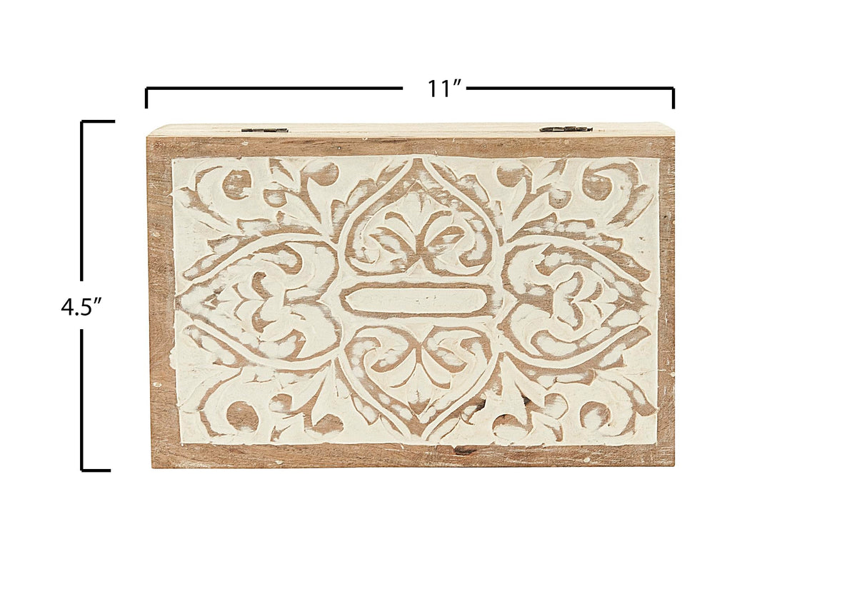 These Beautiful Whitewashed Boxes Can Be Displayed Laying Flat Or On A Side. The Gorgeous Handcarved Design In The Mango Wood Makes It A Decoration Piece That Can Have Items Hidden Inside. Stand One Up Vertically And The Other Horizontally Next To It For A Decorative Accent.