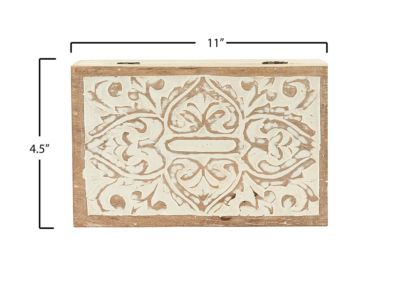 Q: What makes these boxes a unique decorative piece?A: The combination of beautiful handcarved designs and a whitewashed finish makes these mango wood boxes not only functional for storage but also a stunning addition to any room.
