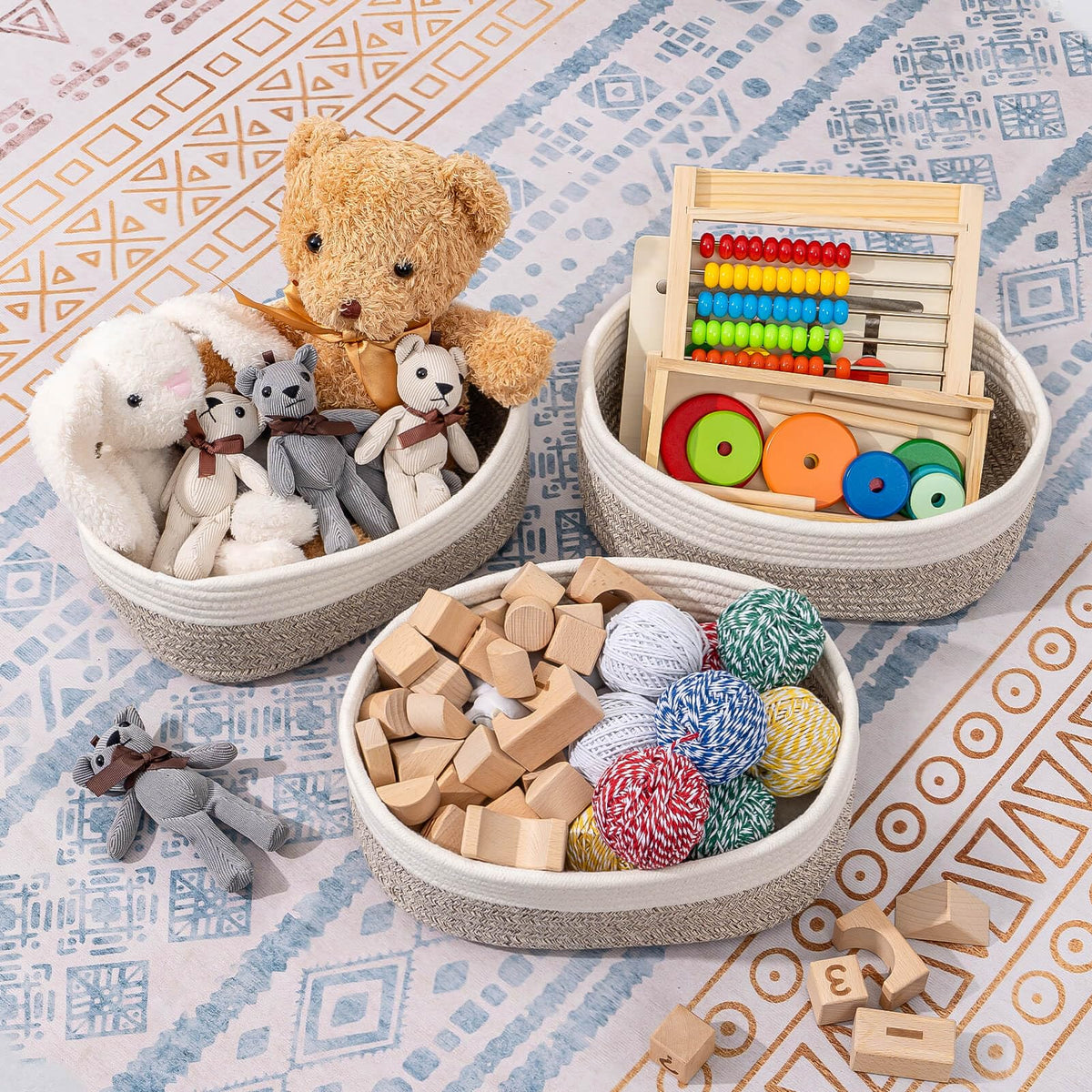 Q: What materials are used in the CubesLand Baskets?A: These baskets are made from high-quality natural cotton rope, ensuring they are sturdy, long-lasting, and skin-friendly while maintaining a stylish appearance.