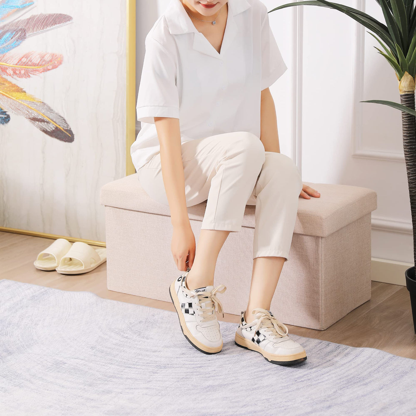 Cuyoca Storage Ottoman Bench Foldable Seat Footrest Shoe Bench End Of Bed Storage With Flipping Lid, 75L Storage Space, 30 Inches Linen Fabric Beige