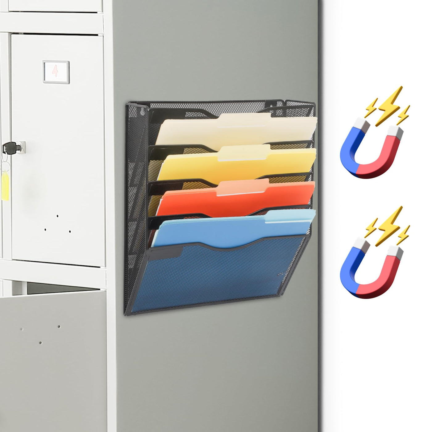 Easepres Magnetic 5 Pockets Wall File Holder Organizer Hanging Magazine Rack, Black Organizer Your Files Get Your Papers, Mail And Stationery Items In Order By Filing Them Tidily In Our Vertical Mounted Wall File Holder. The Stylish Mesh Arched Design Allows Easy Access To Files And Retrieval. Space Saving Separate Your Files And Papers Into 5 Stacked Tray Levels With Label Panels Allow For Labeling Contents Of Each Slot So You Know Where All Of Your Important Paperwork And Spare Paper Is Stored. Each Compartment Can Take Letter Paper Sizes Which Is Ideal For Busy Offices And Work Environments. Use Our Wall Mount Mail Holder For Letters, Files, Forms And Worksheets.
