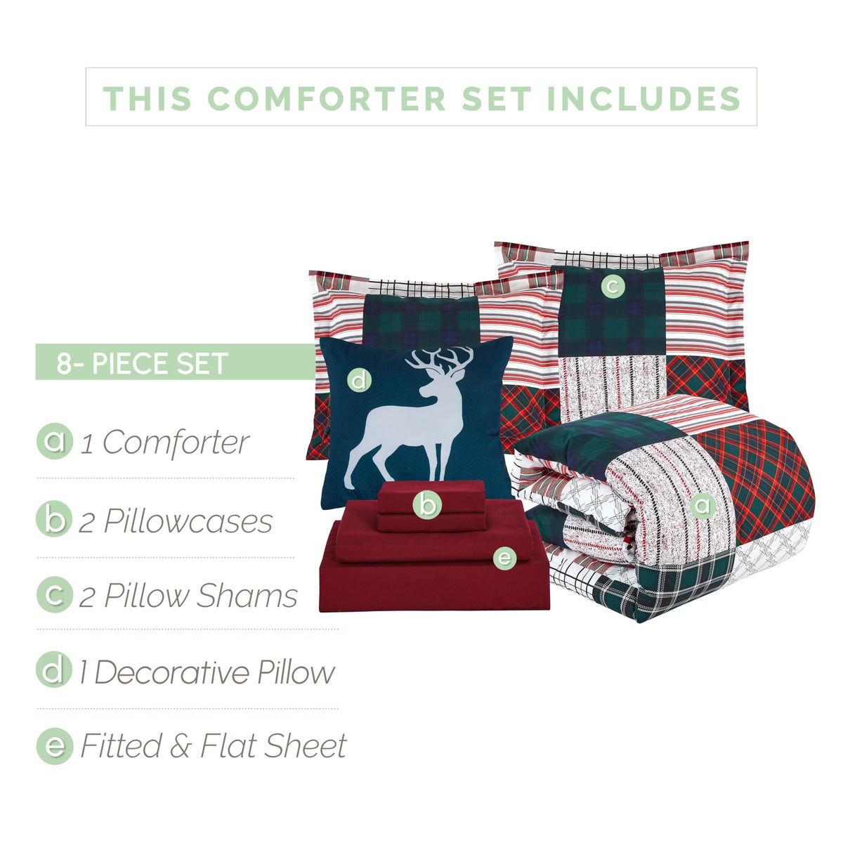 Elegant Comfort 8- Piece Cabin Patch Reversible Comforter Set Bed-In-A-Bag Set - Silky Soft Complete Set Includes Bed Sheet Set With Double Sided Storage Pockets, Full/Queen, Burgundy