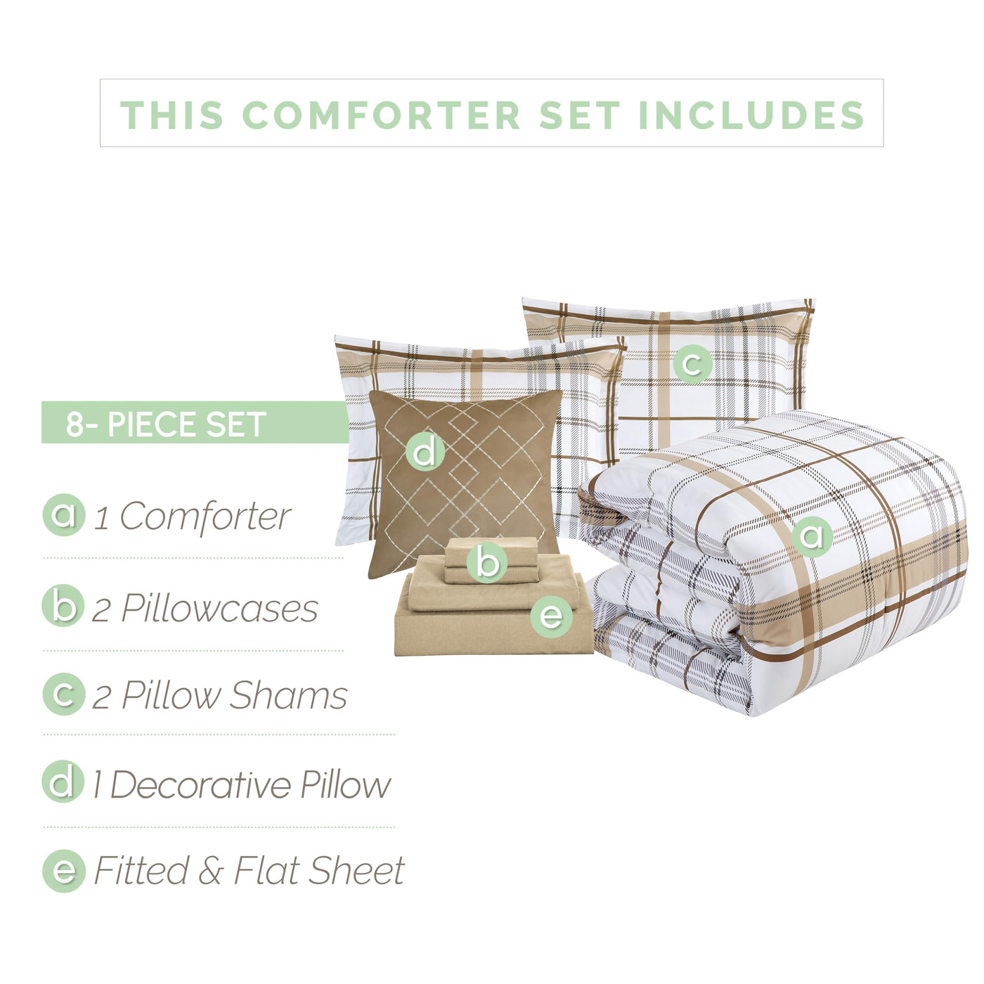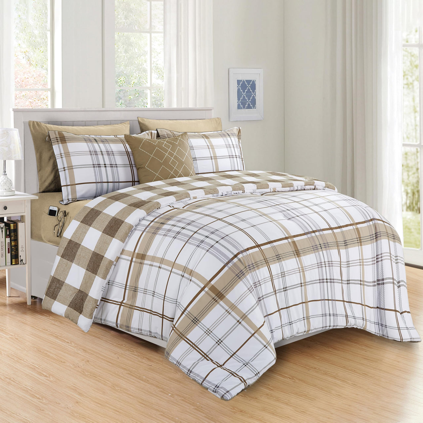 Elegant Comfort 8- Piece Lodge Plaid Reversible Comforter Set Bed-In-A-Bag Set - Silky Soft Complete Set Includes Bed Sheet Set With Double Sided Storage Pockets, King/Cal King, Taupe
