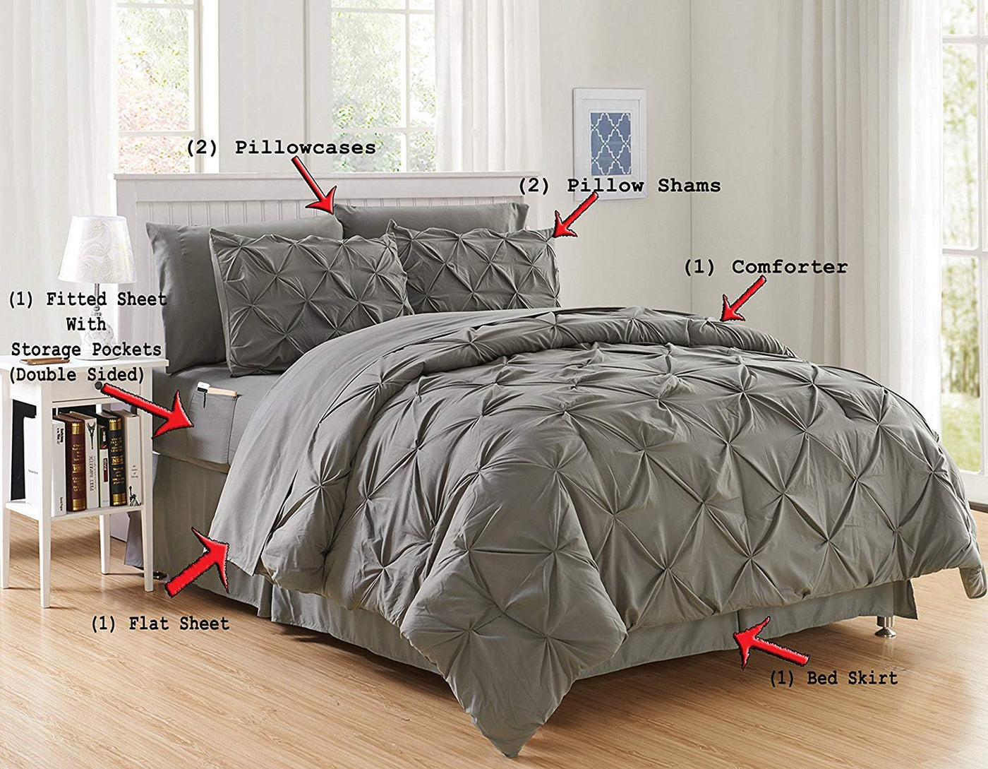 Experience a fabulous night's rest with our Elegant Comfort Hi-Loft Luxury 8-Piece Bed-in-a-bag comforter set! Bed-in-Bag Comforter set includes Bed Sheet Set with Double Sided Storage Pockets on the Fitted Sheet! You can put your glasses, remote controls, cell phones, IPADs, medicines, reading books, pens, or napkins if you ever get sniffles. Pintuck design with double-needle sewn thru construction eliminates shifting for evenly distributed warmth. Filled with 100% down fiber for superior loft and all year-round comfort. All-season Bed in a Bag comforter set is cozier, softer and loftier! Ultra-soft, microfiber down-alternative shell and filling provides cozy yet breathable warmth and it's machine-washable! Luxury Pintuck design with Double-Needle stitching prevents the filling from shifting and bunching. Unlike other down-alternative comforters and blankets, better than down pampers you with the softness, loft, warmth and breathability of down in easy-care microfiber.