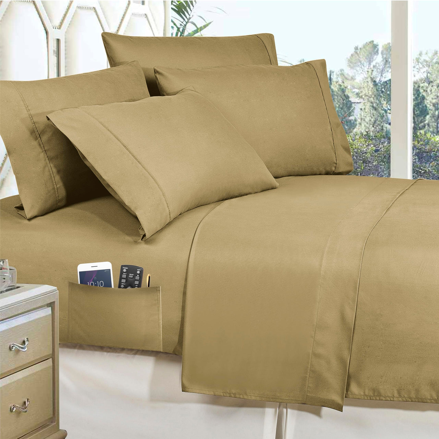 Experience a fabulous night's rest with our Elegant Comfort Hi-Loft Luxury 8-Piece Bed-in-a-bag comforter set! Bed-in-Bag Comforter set includes Bed Sheet Set with Double Sided Storage Pockets on the Fitted Sheet! You can put your glasses, remote controls, cell phones, IPADs, medicines, reading books, pens, or napkins if you ever get sniffles. Pintuck design with double-needle sewn thru construction eliminates shifting for evenly distributed warmth. Filled with 100% down fiber for superior loft and all year-round comfort. All-season Bed in a Bag comforter set is cozier, softer and loftier! Ultra-soft, microfiber down-alternative shell and filling provides cozy yet breathable warmth and it's machine-washable! Luxury Pintuck design with Double-Needle stitching prevents the filling from shifting and bunching. Unlike other down-alternative comforters and blankets, better than down pampers you with the softness, loft, warmth and breathability of down in easy-care microfiber.