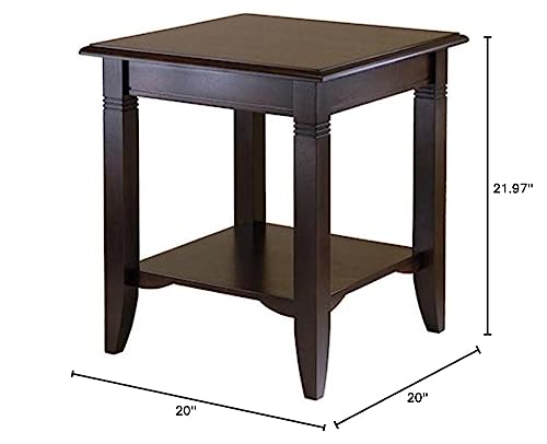 The Ergode Wood Nolan End Table is a versatile and durable piece that effortlessly blends into any room. It offers both practicality and style, serving as a convenient storage solution for various items. Whether placed in an entryway, beside a sofa or bed, or anywhere else, this table provides a sleek surface and a useful shelf. The timeless cappuccino finish complements any decor, while the tapered legs with ribbed accents add a touch of elegance. The beveled edges add a sophisticated detail. The lower table can be used to store books, crafts, and small items, while the top surface is the perfect height for placing a glass, lamp, or other essentials. To achieve a cohesive look, you can coordinate this table with other furnishings from the Nolan line. Made from solid wood and composite materials, it is both sturdy and dependable. The table is conveniently packed and shipped in one box, requiring minimal assembly. In the event of any issues, replacement parts can be requested directly from the manufacturer within 60 days of purchase. The dimensions of the table are 20" W x 20" D x 21.97" H, with a weight of 20.15 pounds.