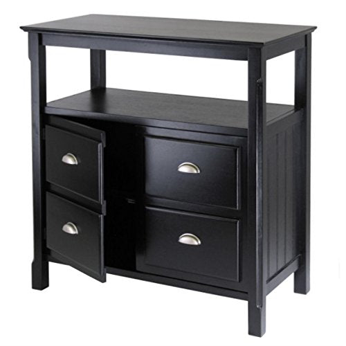 The Ergode Wood Timber Buffet Cabinet is a classic, versatile piece of furniture that provides accentual contemporary storage to your home or office with a nice clean design. It’s simple black finish makes it easy to compliment almost any décor all while the brushed aluminum drawer pull offers a striking contrast of elegance. The headboard-inspired side panels and sculpted square legs help accentuate the look. Featuring an open shelf compartment and two doors with a shelf within for plenty of storage. So, whether it’s in your bedroom for clothes and towels, or in your home office for binders and books, you’ll have ample storage to keep organized. Complete your living area with the additional items from the Ergode Timber collection for a unified space (each sold separately). Conveniently packed and shipped in 1 box, that includes the hardware necessary for assembling. Replacement part request can be submitted directly to the manufacturer within 60 days from date of purchase. Open shelf: 30.8"W x 16.2"D x 8.2"H Shelf surface: 30.8"W x 15.5"D x 9.25"H Assembly required . Dimension: 36" W x 18.03" D x 35.98" H, Weight: 55.12