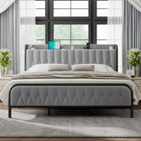 Feonase Velvet King Szie Bed Frame With Fast Charging Station,Metal Platform Beds With Upholstered Headboard & Footboard,12' Underbed Storage Space, Easy Assembly,Noise-Free,Matte Gray