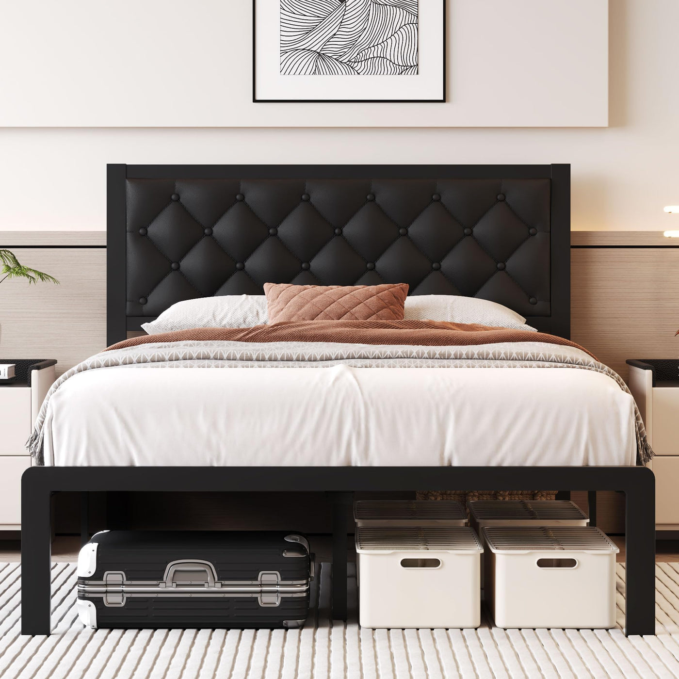 Fluest Full Bed Frame With Headboard Pu Leather Upholstered Bed Frame Platform,All Metal Slats Support Platform Bed Frame With Storage Space,Easy Assembly,Noise Free,No Box Spring Needed,Black