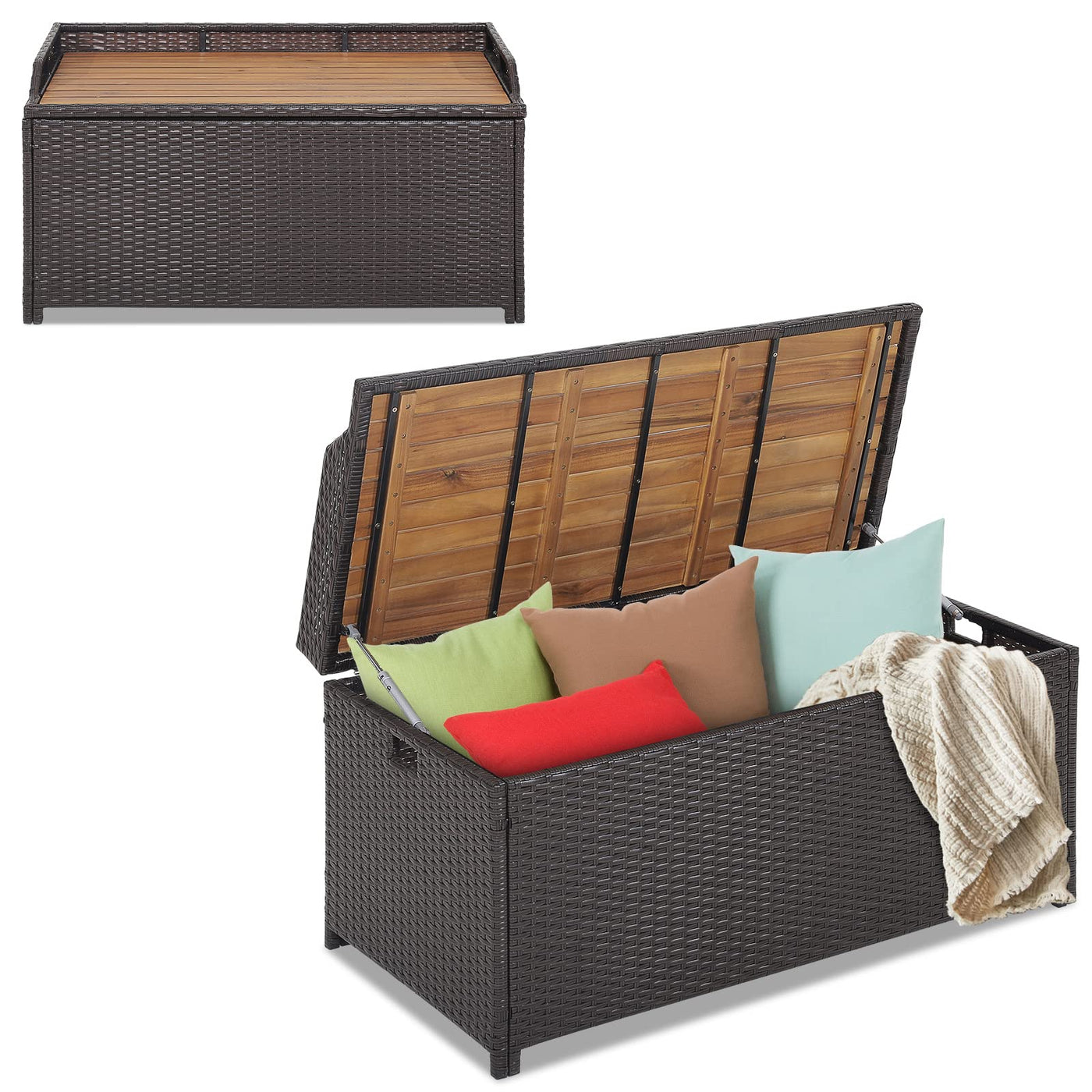 Description: Sit And Organize With Our Multipurpose Rattan Storage Box! The Large 45-Gallon Storage Box Provides Additional Storage Space For Your Outdoor Furniture, Gardening Tools, Sports Equipment, Etc. With High Quality Gas Strut, The Opening And Closing Of The Lid Is Labor-Saving. Moreover, It Is Also A Large Bench For You To Relax. The Sturdy Acacia Wood Seat Can Hold Up To 795 Lbs. In Addition, The Bottom Of The Storage Box Is Reinforced With Metal Structure To Ensure Excellent Stability. Made Of Mix Brown Pe Rattan, The Storage Box Is Weather-Resistant And Appealing, Making It The Perfect Addition To Your Poolside, Balcony, Garden, Deck. And It'S Full Of Exquisite Details, With Hollowed Out Handles For Moving It Outdoors, And Non-Slip Pads To Avoid Scratching Your Floor As You Move. Features: 45 Gallons Versatile Storage Box Can Hold Pillows, Toys And Tools Zipper Polyester Liner With Pu Coating Is Waterproof And Washable Hand-Woven Mix Brown Pe Rattan Is All Weather And Elegant Gas Strut Ensure Flexible Opening And Provide Reliable Support For The Lid Premium Acacia Wood Seat Is Sturdy And Not Easily Deformed Reinforced Metal Frame On The Bottom Enhances Load-Bearing Can Be Used As A Large Bench For 2 People Or A Coffee Table Convenient Cut-Out Handles Make It Convenient To Move Anti-Slip Foot Pads Protect The Floor From Being Scratched Simple Design Can Be Coordinated With Various Occasions Please Do Not Expose The Storage Box Outdoors In Rainy Days Specifications: Color: Mix Brown Material: Pp Rattan, Metal, Polyester Cloth Product Dimension: 40' X 20' X 20' (L X W X H) Open Dimension: 40' X 20' X 36.5' (L X W X H) Internal Dimension: 38.5' X 18.5' X 14.5' (L X W X H) Capacity: 45 Gallons Bench Height: 18' Top Load Capacity: 795 Lbs Internal Load Capacity: 66Lbs Net Weight: 27.5 Lbs