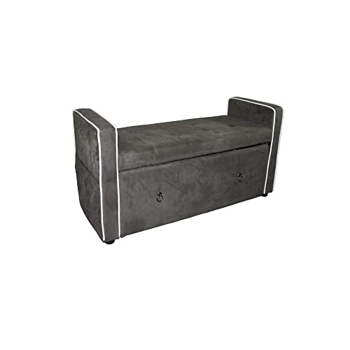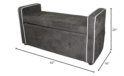stylish solution to your storage needs, the Olive Gray Suede Shoe Storage Bench with Drawer is the perfect accent piece for your entryway, bedroom, or living room. Features a front opening storage compartment drawer that pulls out. The high-density polyfoam seat will provide optimal comfort and support, and the bench is masterfully upholstered in a beautiful super soft brown suede with white piping on the arms for that eye-catching look. Perfect for adding extra seating and storage in your entry foyer or master bedroom. Made with a solid wood frame, this attractive bench will last for years. 22'H x 42'W x 16'D
