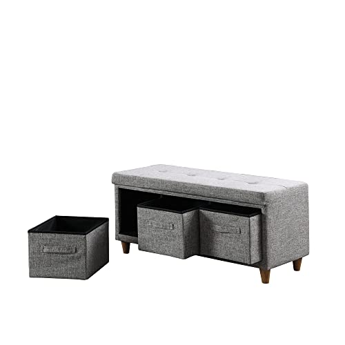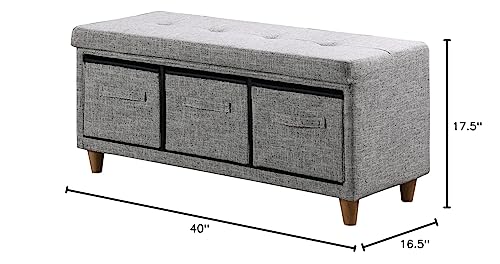 Add storage and seating with the charming gray storage bench with basket drawers. It is a great option to add function and character to your entryways, bedrooms or hallways. Use the three storage baskets to store shoes, hats, gloves or toys. It is masterfully upholstered with a beautiful tufted top, gray fabric and features classic wooden legs. Beautifully crafted, this versatile bench is perfectly suitable as a window bench or end of bed bench. Made with a sturdy wooden frame, it is durable and will last for many years. 17.5'H x 40'W x 16.5'D