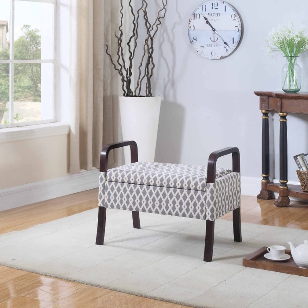 Eye-catching and super stylish, the Trellis Print Mid-Century Vanity Storage Bench is a beautiful piece that blends style with functionality. Features easy-access storage space for your essential items. The seat features thick plush foam padding and beautiful fabric for added comfort and a luxurious look. The elegantly curved bench legs feature an espresso brown finish. An exquisite piece to add storage and vitality to your dressing table. 23'H x 30'W x 20'D