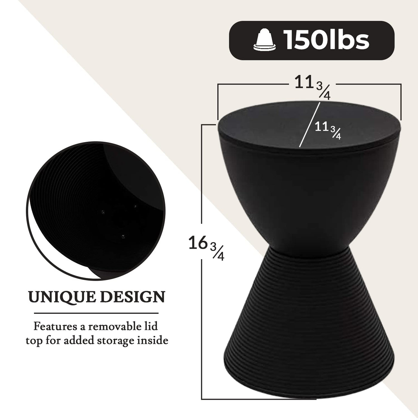 Elevate any space with Boyd Modern Side Table. Featuring a unique hourglass shape with smooth curves and a ribbed bottom for added texture, it brings elegance to any room. Crafted from durable polypropylene, it supports up to 150 pounds and is ideal for both decorative and practical use. A smooth top lifts off to reveal hidden storage for items like remotes and magazines. Measuring 11.75 inches in width and depth and 16.75 inches tall, this compact, lightweight table is perfect for any setting. Ready to use out of the box and suitable for both indoor and outdoor environments, it’s UV-protected to maintain its look. Add a touch of modern elegance and hidden practicality to your space with this versatile hourglass side table- where style meets functionality in every curve.