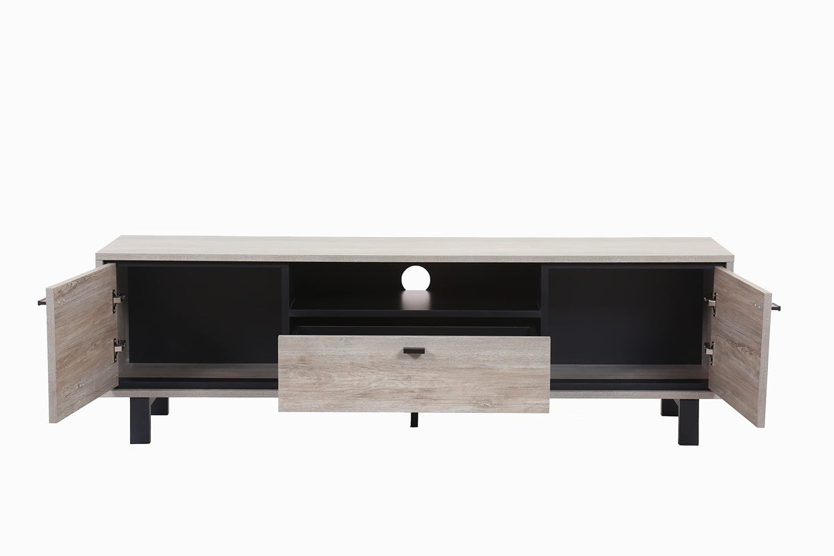 The Apollo TV stand features multiple storage spaces. The two cabinets, one center drawer, and one open shelf can store all your media essentials. Behind the cabinet door is a spacious open space. The cable management cutout on the back of the shelf helps to thread your cables through to hide the wires easily. The clean-cut and low profile is perfect for the minimalist design of any living space.
