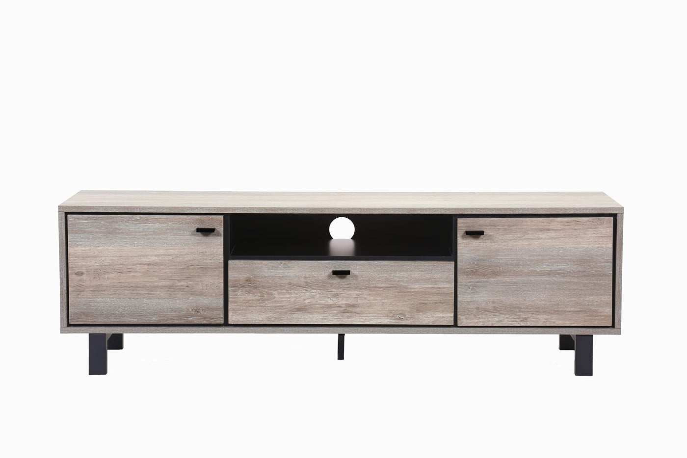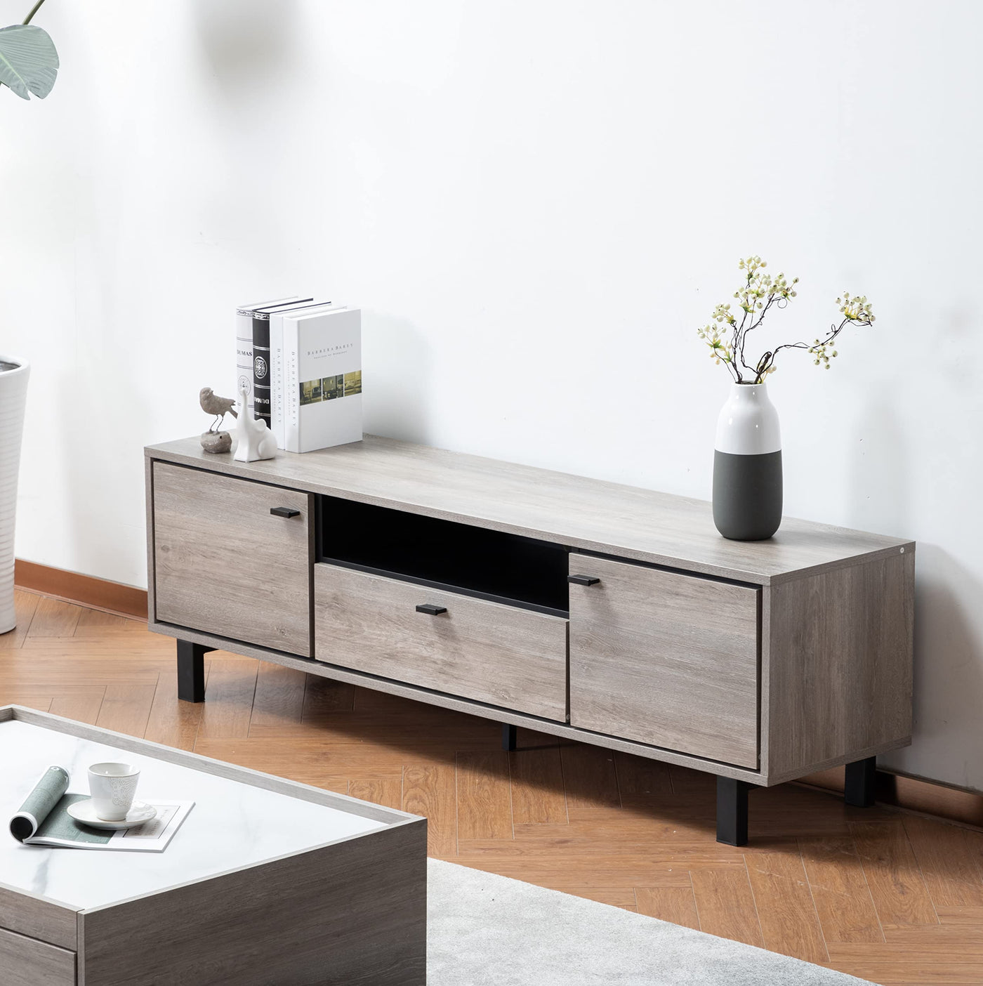 Lilola Home Apollo 65' Gray Oak Finish TV Stand with Storage, Cable Management and Black Handles