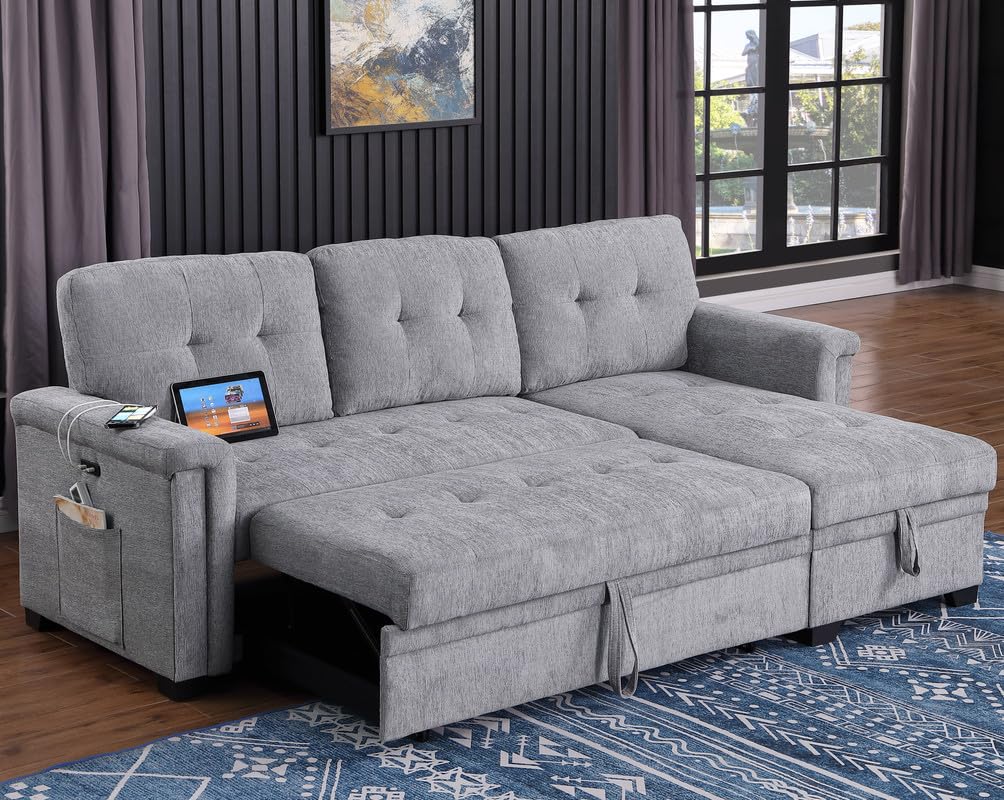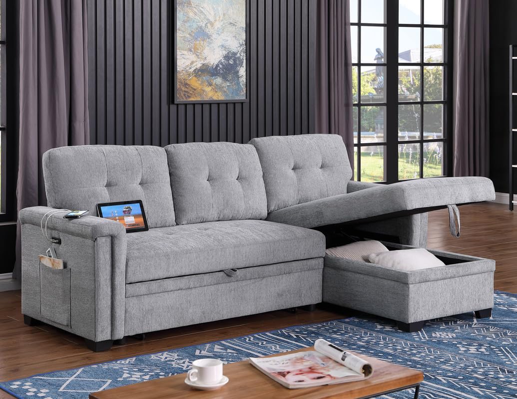 Lilola Home Ashlyn 83.5' W Light Gray Chenille Reversible Sleeper Sectional Sofa with Storage Chaise, Charging Ports, Side Pockets