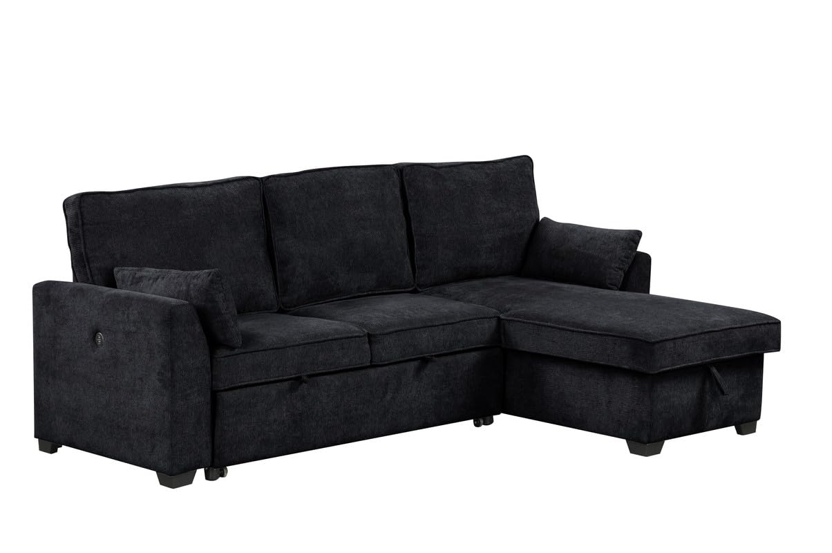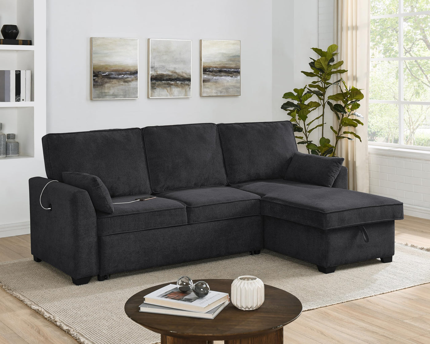 Lilola Home Ember 92' W Black Fabric Sleeper Sectional with Reversible Storage Chaise, USB Charging Ports, and Cupholders