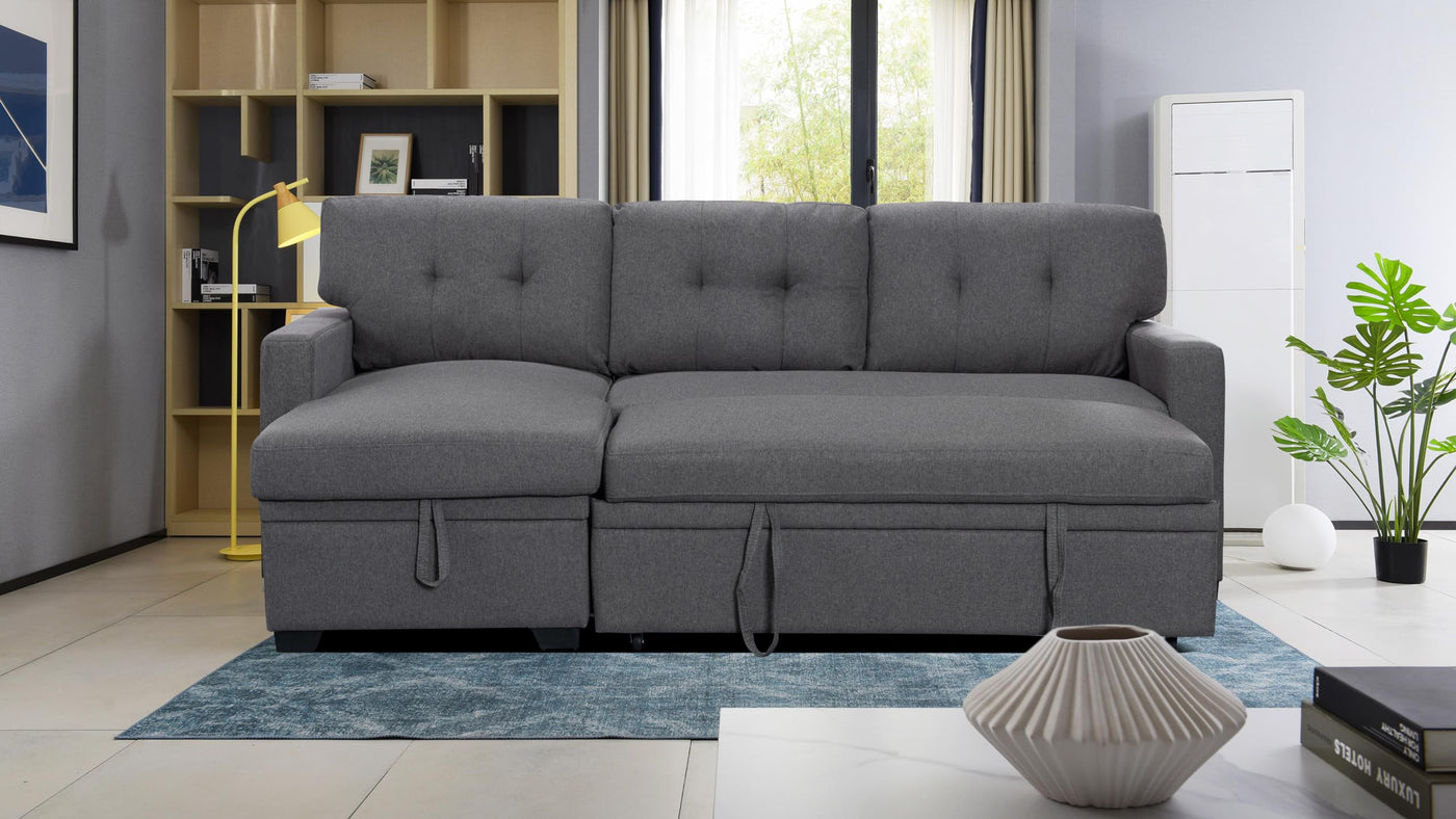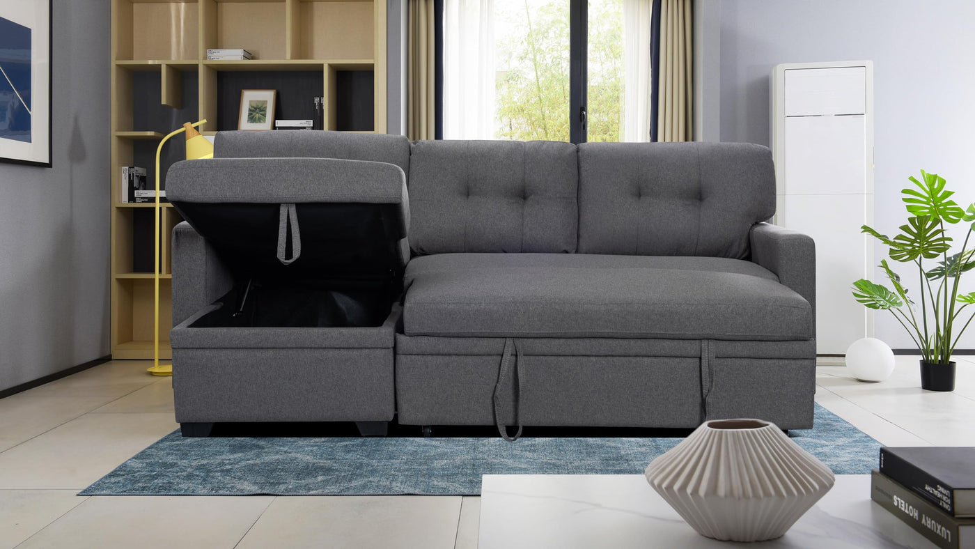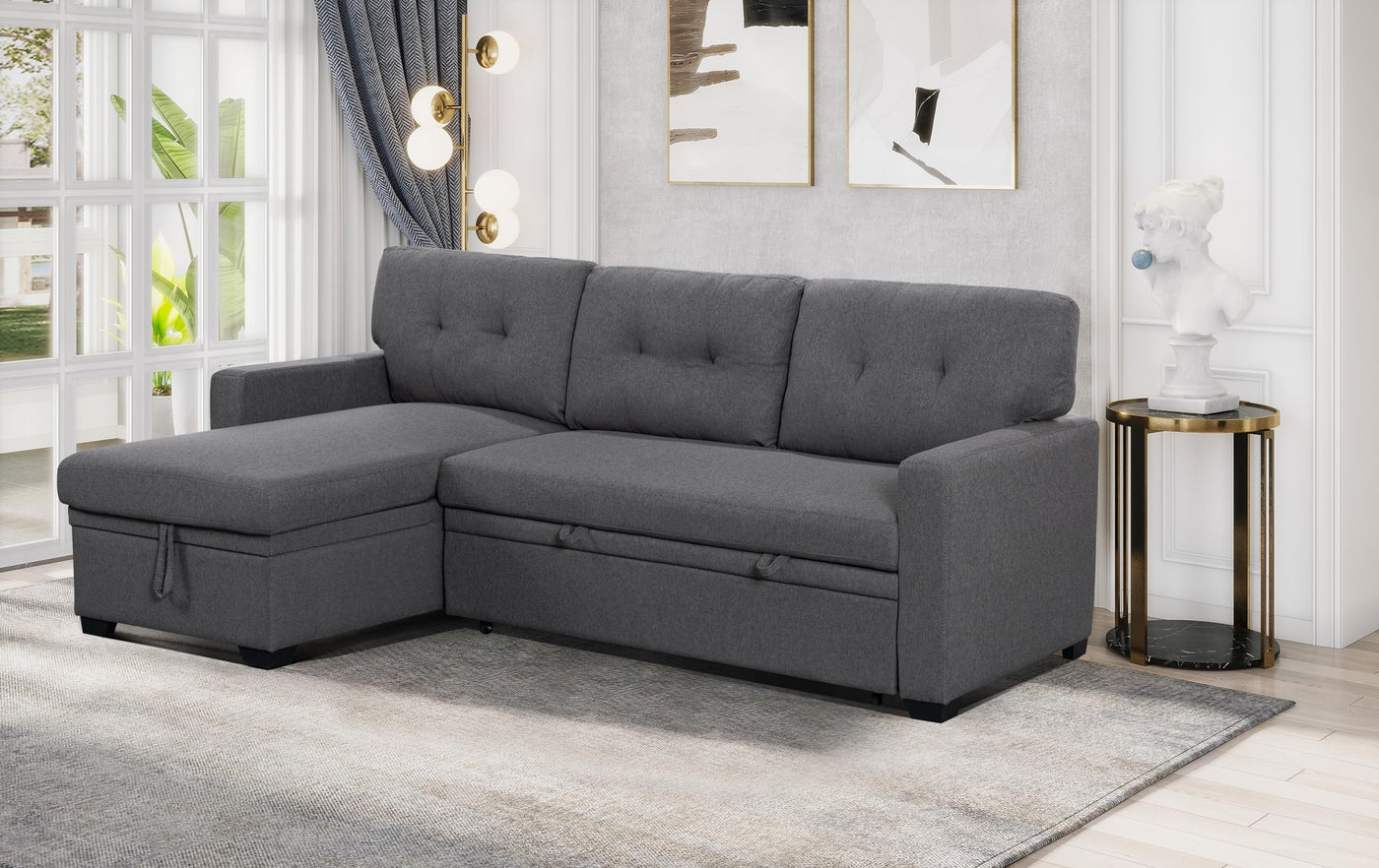 Introducing our Miller Reversible Sleeper Sectional Sofa with storage, the perfect blend of comfort, style, and functionality for your living space. This versatile piece is designed to cater to your seating and sleeping needs, while offering ample storage space to keep your living area organized and clutter-free. The reversible chaise allows you to adapt the configuration to suit your preferences and space requirements, providing flexibility and versatility. When it's time to unwind or accommodate overnight guests, the pull-out sleeper feature comes to the rescue. The tufted back cushions not only add an elegant touch to the design but also provide enhanced comfort and support. Additionally, the storage compartment integrated into the sofa chaise provides a convenient solution for keeping your belongings neatly organized and easily accessible. Experience the perfect blend of style and practicality with this sofa chaise sleeper.