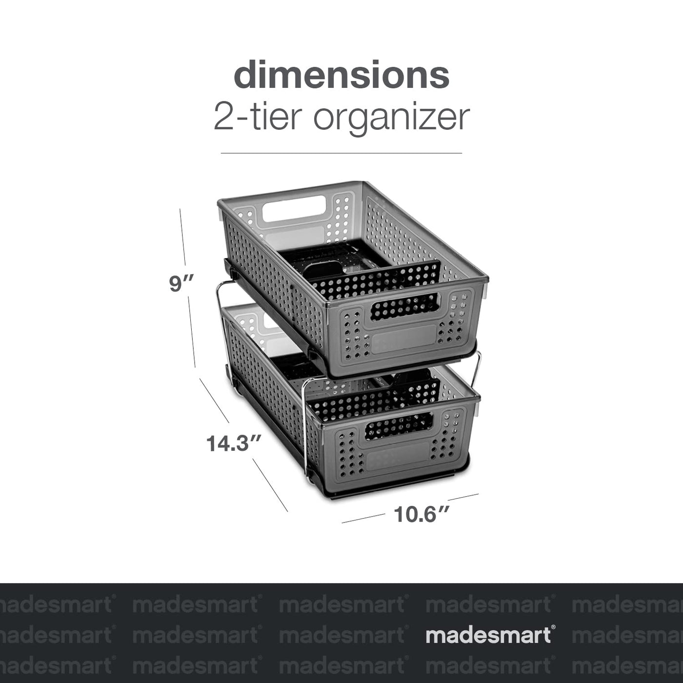 Q: What are the dimensions of the Madesmart 2-Tier Organizer?A: The Madesmart 2-Tier Organizer measures 14.37 inches in length and 9.02 inches in width, making it a compact yet spacious solution for various storage needs.