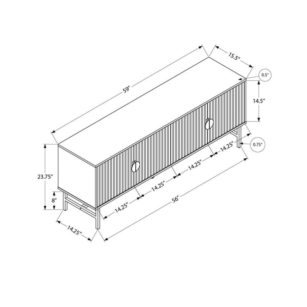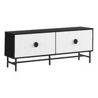 This contemporary tv stand is the perfect solution to any living room or bedroom. The sleek modern design with a black and white laminate finish and black metal accents, adds a modern elegance and sophistication to any space. The 60 inch console features two closed ribbed white cabinets with fixed shelving, two wire management holes in the back, and an easy to clean top. Not only is this tv console perfect as your media entertainment center, but also provides extra storage. It is easy to assemble with illustrated instructions and hardware included, and comes backed with a 5-year limited warranty for manufacturer's defects.