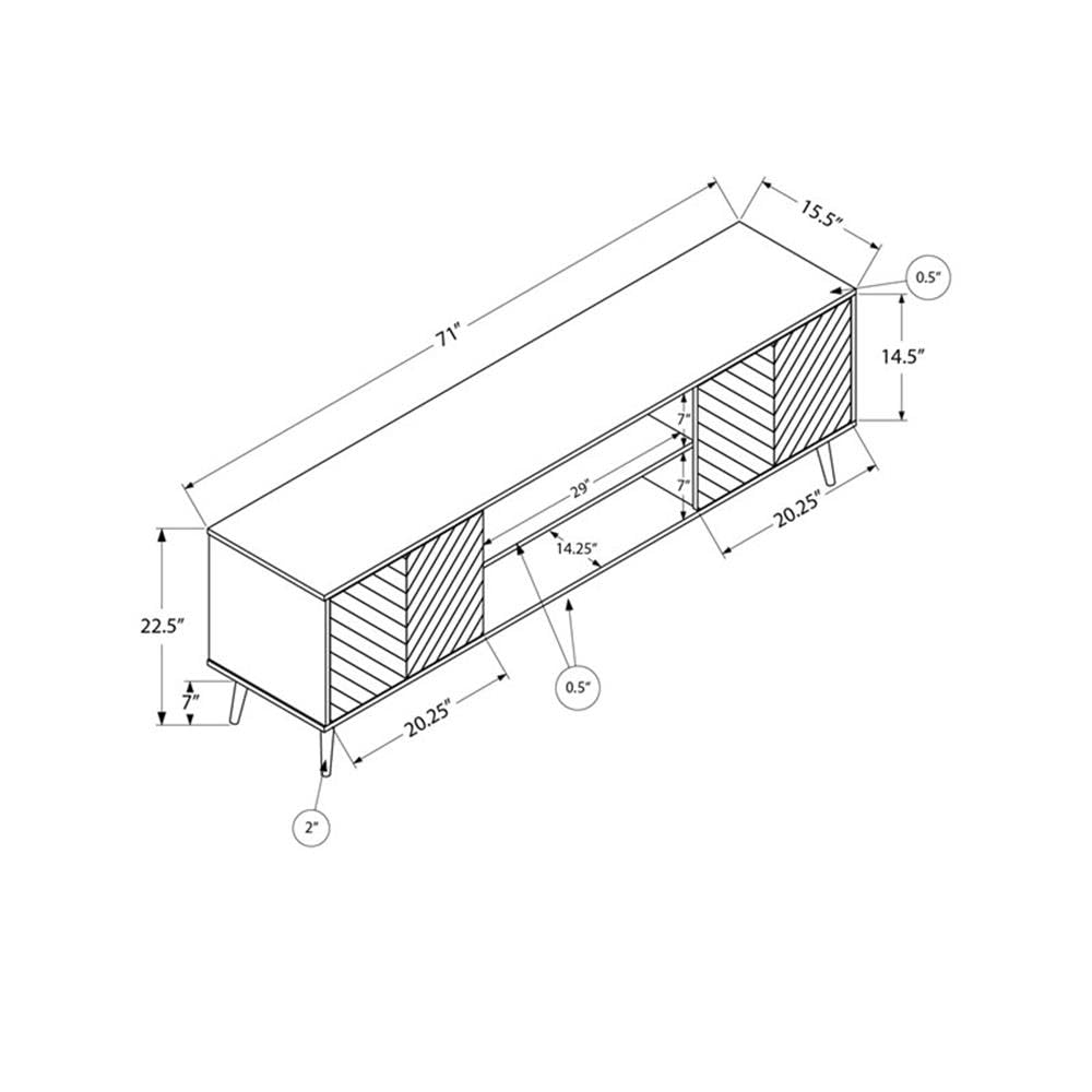 Make a home for your big screen tv with this contemporary 72 inch tv stand and all encompassing media entertainment center that is sure to be the perfect addition to any living room or bedroom space. This durably designed and stylish console features a brown and black laminate finish, sturdy black wood legs and wood-look brown doors in a slanted pattern to complete the modern look. This tv console includes 2 closed cabinets to store all your media items, with a push latch mechanism for easy opening and closing. There is plenty of storage space inside each cabinet that includes a fixed shelf and two wire management holes to keep cords neat and organized. Plus, you'll have peace of mind knowing that this TV stand is backed by a 5 year limited warranty against manufacturer's defects. This media center is easy to assemble with full illustrated instructions and hardware included for your convenience.