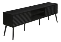 Elevate your entertainment area to a whole new level with our 72 inch tv stand in a black laminate finish featuring 2 stylish sliding doors and storage shelves. This retro style media console is not only fashionable but also durably designed with solid wood legs. With open storage shelves as well as closed storage, you can easily showcase audio/visual components while keeping them organized. Say goodbye to messy cables thanks to the easy cable management system behind the fixed shelves. Enjoy the convenience of this easy to assemble unit with all hardware included. The easy to clean top ensures your tv stand stays looking fresh and new for years to come. Whether this is for your bedroom or living room, this console is the perfect addition to any contemporary space, and with a 5 year limited warranty, you can trust that this piece is solidly constructed to last. Upgrade your media entertainment center with this fashionable style console that includes storage cabinets to keep things organized and out of sight.