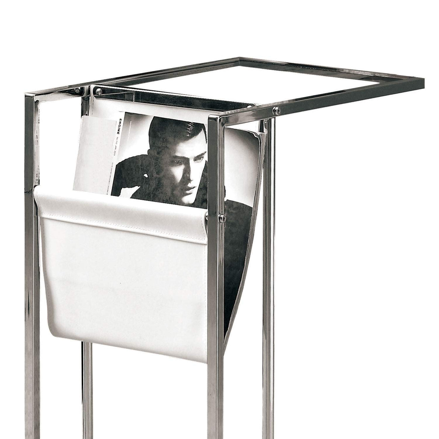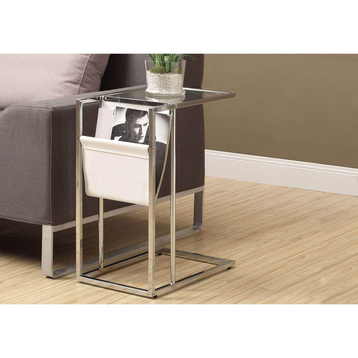 Monarch Specialties 3034, C-Shaped, End, Side, Snack, Storage, Living Room, Bedroom, Pu Leather Look, Clear Accent Table Chrome Metal with A Magazine Rack, 12' L x 19.5' W x 24' H, Glossy White
