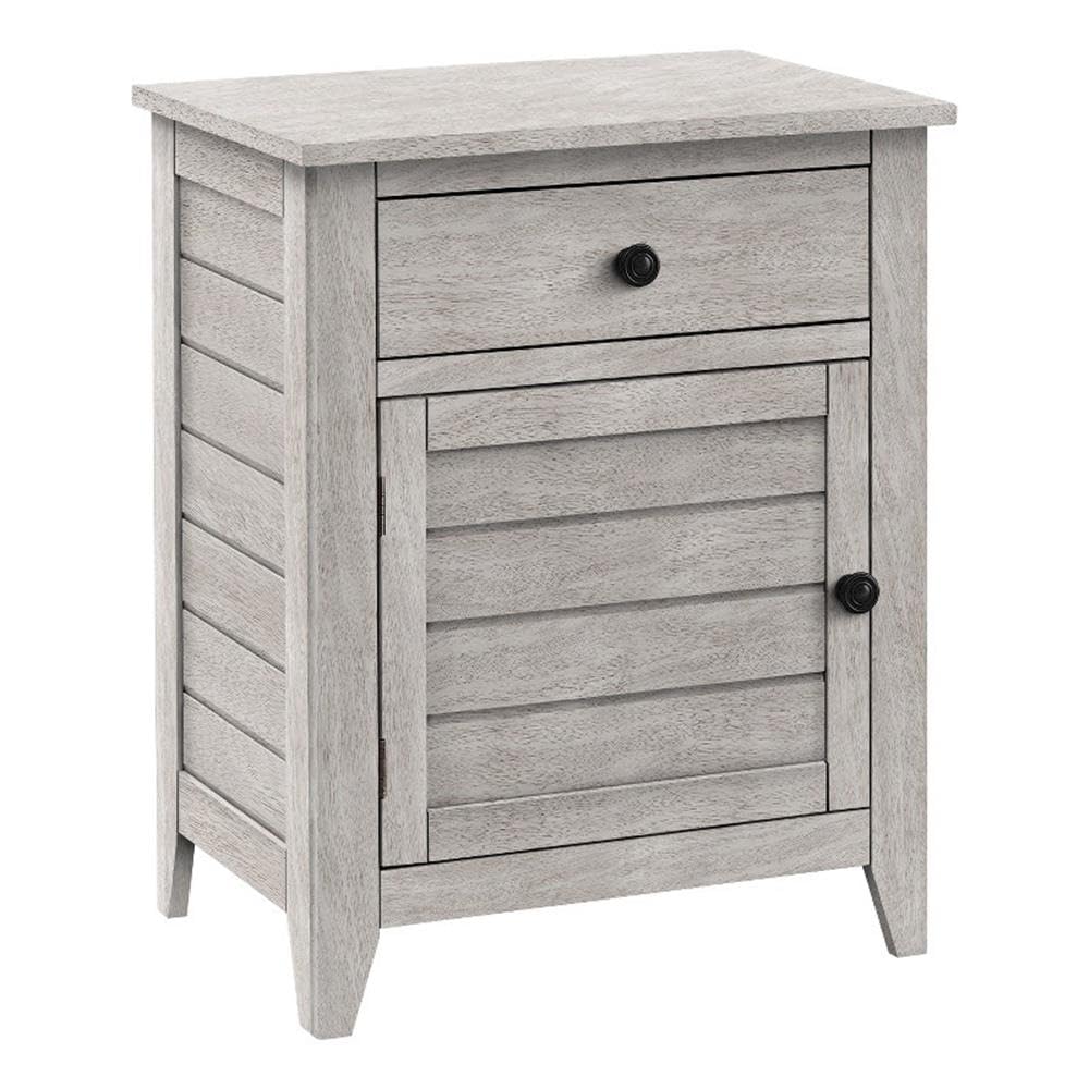 Here is a fashion forward, 25 inch high transitional accent table ready to add that casual coastal vibe to your space! With a breezy washed grey veneer finish, this chic side table is not only practical but durably designed for many years of enjoyment. Say goodbye to clutter as this space saving end table features a convenient storage drawer and closed cabinet for keeping essentials within reach but out of sight. This versatile table is complimented with clapboard paneling on the front and sides and simple black metal knobs. Place this table next to a sofa or armchair in a living room, or bring it into the bedroom as a nightstand for an upgraded relaxed look. Easy to assemble with illustrated instructions and all hardware with floor protectors included. This accent table comes with a 5 year limited warranty against manufacturer's defects for a confident purchase.