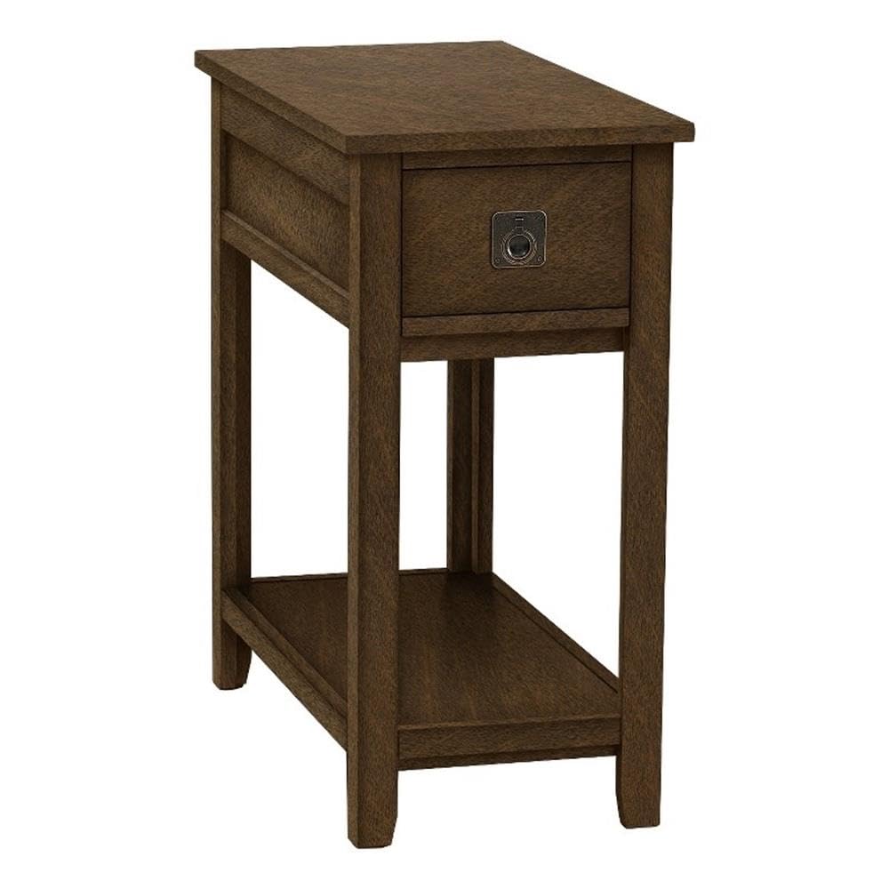 Introducing a stylish and practical accent table, perfect for adding a fashionable touch to any type of living area. Standing at 24 inches high, this durably designed accent table with a warm espresso brown veneer finish includes a storage drawer with a bronze metal pull and a bottom shelf, an ideal space-saving solution. This versatile table can be used as an end or side table next to a chair or sofa, as well as a nightstand in a small bedroom. It offers a transitional design allowing you to easily pair it with any furniture or decor. Constructed from quality wood materials with an easy to clean top, this accent table includes a 5 year limited warranty against manufacturer's defects. Easy to assemble with step by step illustrated instructions and all hardware included, this narrow table will fit in all sorts of spaces.
