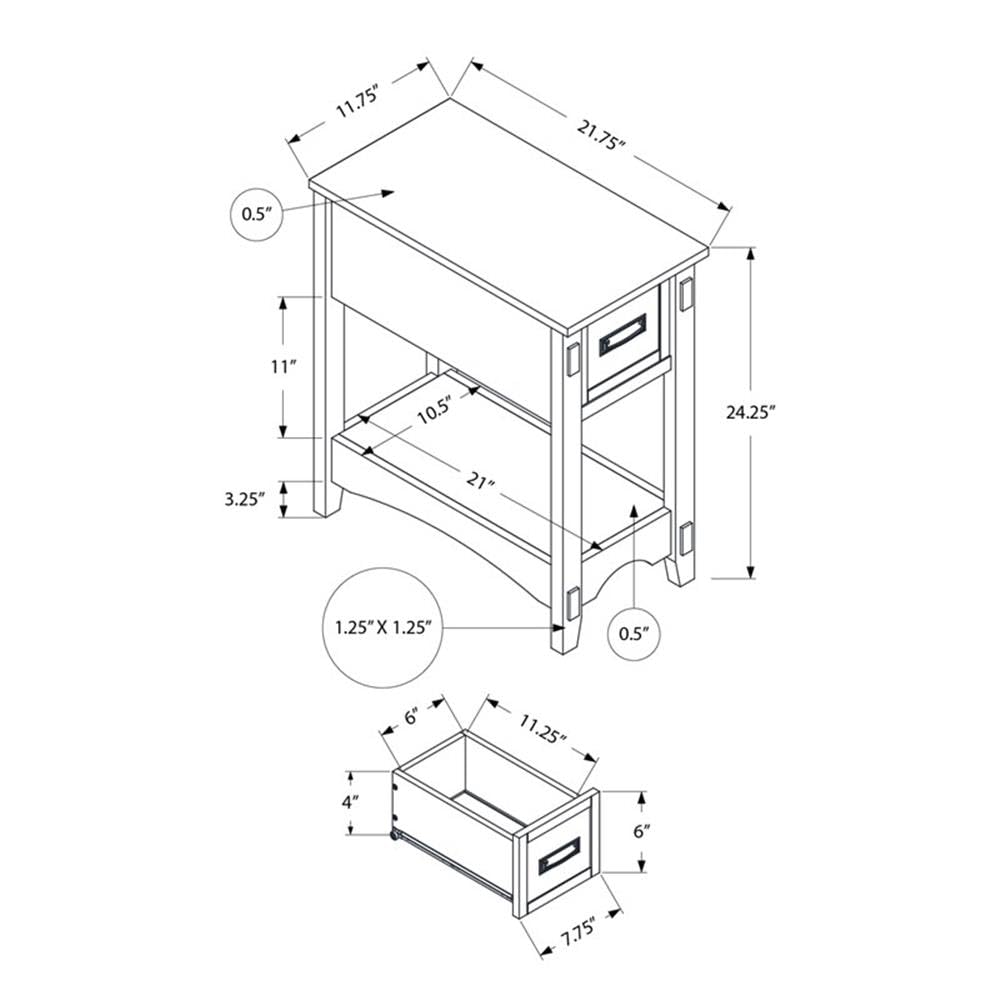 Introducing a stylish and practical accent side accent table, this durably designed furniture piece is perfect for adding a fashionable touch to any type of living area. Standing at 24 inch high, this 2 tier accent table with a warm walnut brown veneer finish, includes a storage drawer with a black metal pull and a bottom shelf, an ideal space saving solution. This versatile table can be used as side table next to a chair, as an end table near a sofa or even as a nightstand in a small bedroom. It offers a narrow transitional design allowing you to easily pair it with any furniture or decor. Constructed from quality wood materials with an easy to clean top, this accent table includes a 5 year limited warranty against manufacturer's defects. Easy to assemble with full illustrated instructions and all hardware included.