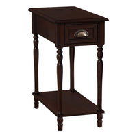 Compliment your space with this must-have 2 tier, 24 inch high accent table. Showcasing a narrow space saving design that is sure to impress whether used as an end or side table next to a sofa or chair in a living room or add a small lamp on the beveled tabletop and bring it into the bedroom as an elegant nightstand. Finished in a warm cherry brown veneer finish with slim turn post legs in a traditional style, this practical accent table features a convenient storage drawer with a stylish bronze metal pull to stow away small essentials, and a shelf at the bottom for additional organizational space. Durably constructed with quality materials, this versatile table includes a 5 year limited warranty against manufacturer's defects for long lasting use. Quick and easy to assemble with full illustrated instructions included, this table will be ready to elevate your home in no time.