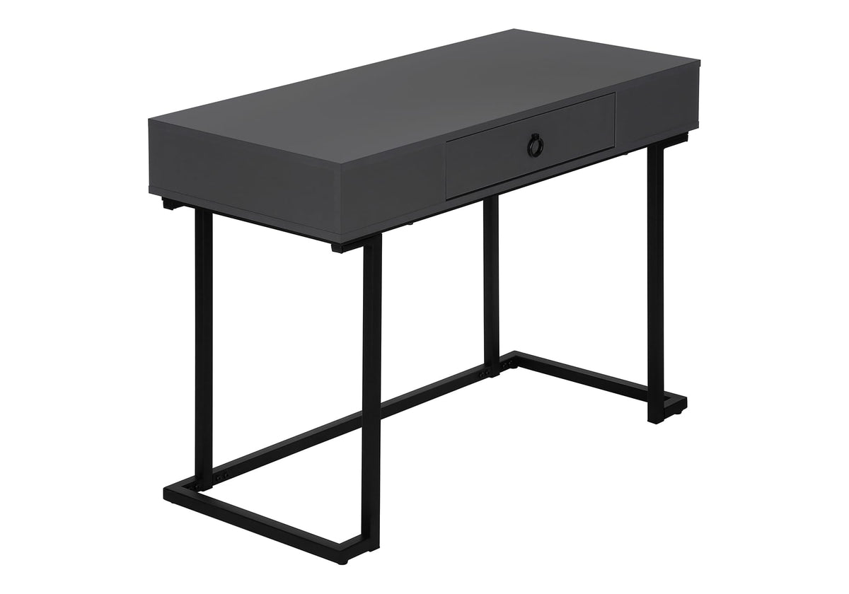 Searching to add glamour to your office space? Then get excited about this writing table! Straight lines and modern black metal legs give this desk a stylish design perfect for the very fashionable. This grey computer desk also provides ample storage with a single large, centered drawer adorned with a chic black ring pull. Sized perfectly for any home office space, this desk would also work as an accent piece or console table, adding glamour to any room in your home.