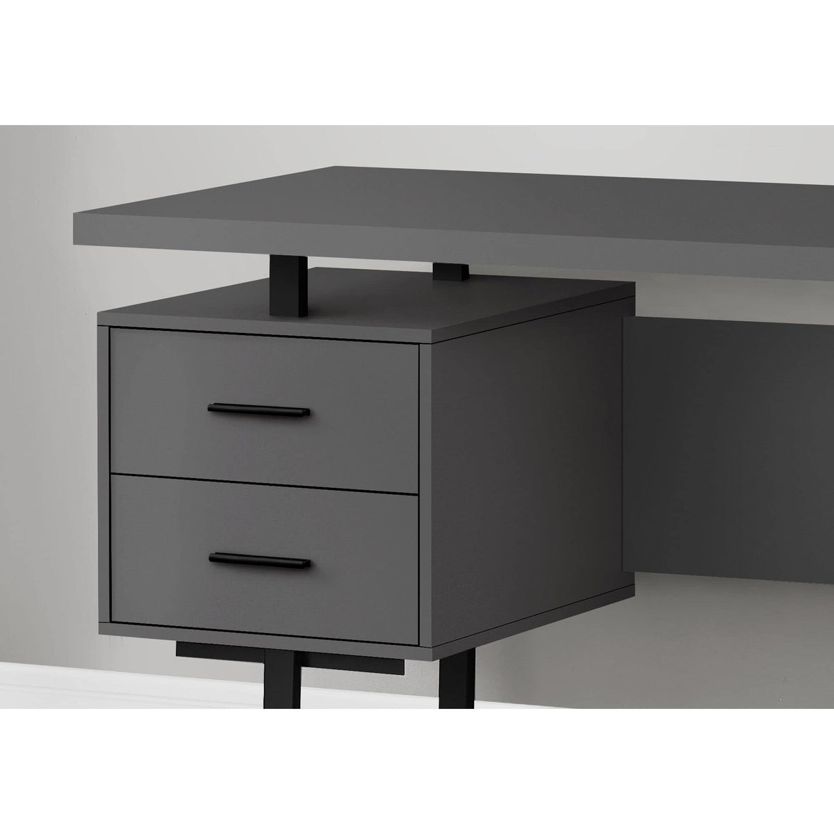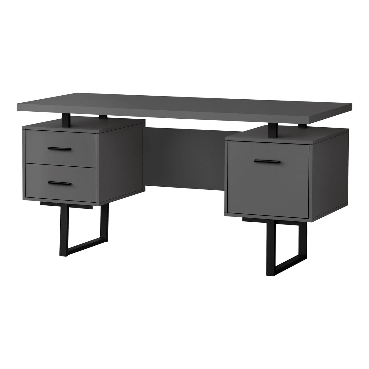 Get down to business at home with this mid-size computer desk. The large desktop easily accommodates a laptop, writing materials, and more. The 1.5-inch thick desktop panel has a special design that makes it appear as if it is floating and allows the tops of the 2 drawer units to be used as additional surfaces. The 3 storage drawers 2 small drawers and 1 large drawer with a hanging file bar offer space for items you want to keep off the desktop. For flexibility, the drawer units are reversible and can be installed on either side according to your preference. This stylish desk will bring a modern look to your home office. The drawer units and desktop are finished in a modern grey laminate that is contrasted by the black finish of the U-shaped metal legs. Additional dimensions: Interior of small drawers: 13.5 inches L x 15.25 inches W x 3.25 inches H Interior of large drawer: 13.5 inches L x 17.25 inches W x 10.5 inches H Space between drawer units: 26.25 inches L Space between underside of desktop and tops of drawer units: 3.25 inches H