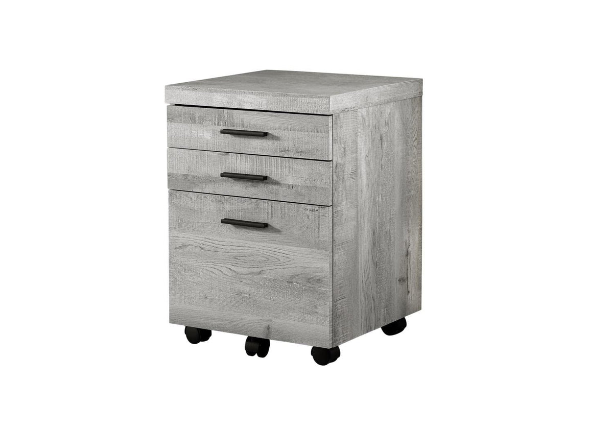 Need a little extra space in your home office? Opt for this practical 3-drawer file cabinet on casters (2 locking, 3 non-locking) accented with beautiful modern black handles on smooth metal glides for easy storage of letters, documents, and legal sized folders. This model is finished in a sleek grey reclaimed wood finish on all sides so that you can match it with any identical desk (sold separately).