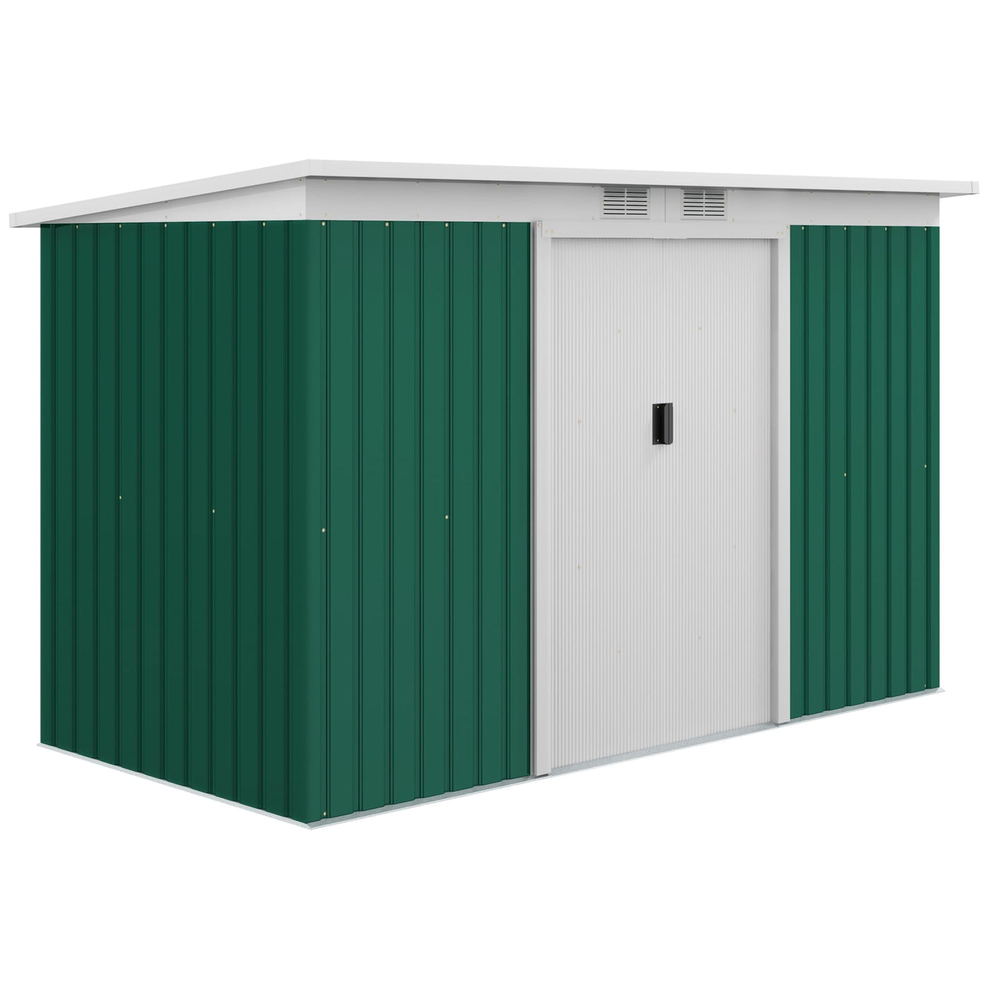 Easily Add Storage Space And Value To Your Property With An Outdoor Garden Shed From Outsunny. An Outsunny Metal Shed Has Distinct Advantages Over Traditional Wooden Models That Make It A Much More Attractive Choice For Purchase. It All Comes Down To Affordability And Durability. A Metal Shed Is More Affordable And Being Pre-Fabricated Significantly Cuts Down On Expenses Relating To Materials And Labor. Our Outsunny Storage Shed Comes Delivered To You As A Kit That Is Easy For Two Individuals To Put Together. A Metal Shed Is More Durable And Offers Better Protection From Hazards Such As Fire, Moisture And Pests. Our Outsunny Shed Comes With A Painted Surface That Is Rust And Weather Resistant As Well As A Sturdy Foundation With Reinforced Walls That Make It Low Maintenance. If You'Ve Been Looking For A Way To Add Much Needed Storage Space To Your Property But Don'T Want To Deal With The Cost And Upkeep Of A Traditional Wooden Model, Then Look No Further Than A Metal Storage Shed From Outsunny. Features: - Spacious Storage Area For Garden Tools, Lawn Care Equipment, Pool Supplies And More - Built From The Finest Galvanized Steel And Durable Polypropylene (Pp) Construction - Includes Floor Frame (Flooring Material Not Included: Plywood Or Pavers Recommended) - Sloped Roof Prevents Moisture And Resists Bad Weather - Double Sliding Doors For Easy Entrance And Access - 2 Vents For Increased Lighting And Airflow - Low Maintenance And Corrosion Resistance - Assembly Required Specifications: - Color: Green/White - Materials: Galvanized Steel, Polypropylene (Pp) - Overall Dimensions: 110 'L X 51 ''W X 67.5 ''H - Inside Dimensions: 105 ''L X 46 ''W X 66.5 ''H - Wall Height: 61.75 '' - Door Dimensions: 37.5 ''W X 60.5 ''H - Vent Dimensions: 8.5 ''L X 4W - Net Weight: 112Lbs'