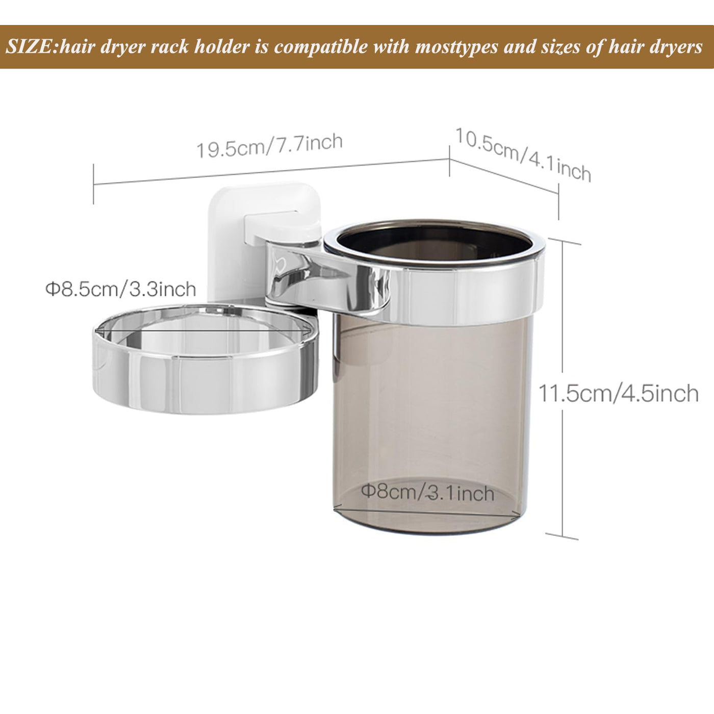 Q: What materials is the hair dryer holder made from?A: The hair dryer holder is made from eco-friendly PVC plastic with a chrome finish, ensuring it is both durable and resistant to water and oil.