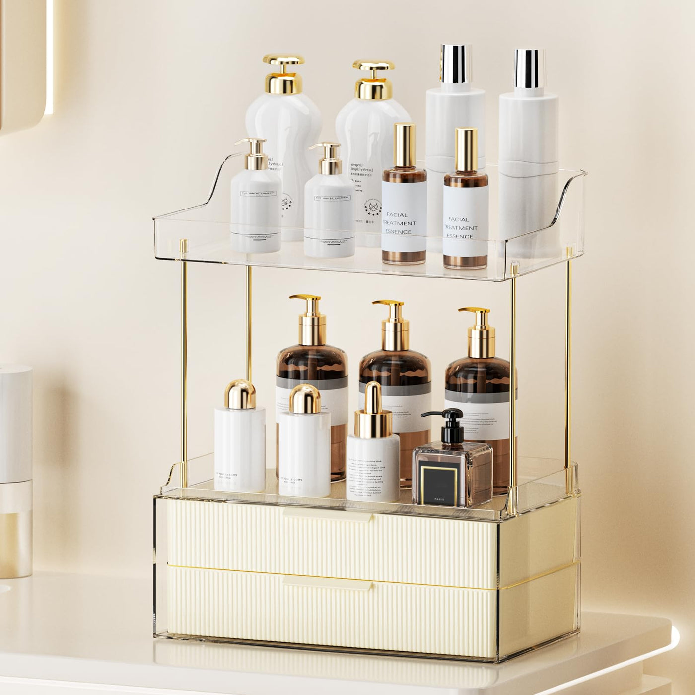 Q: How much storage does this organizer provide?A: This organizer features a large capacity with 2 drawers, 1 middle layer, and 1 top space, designed to accommodate high-bottle skin care products and makeup, helping you keep your bathroom counter tidy.