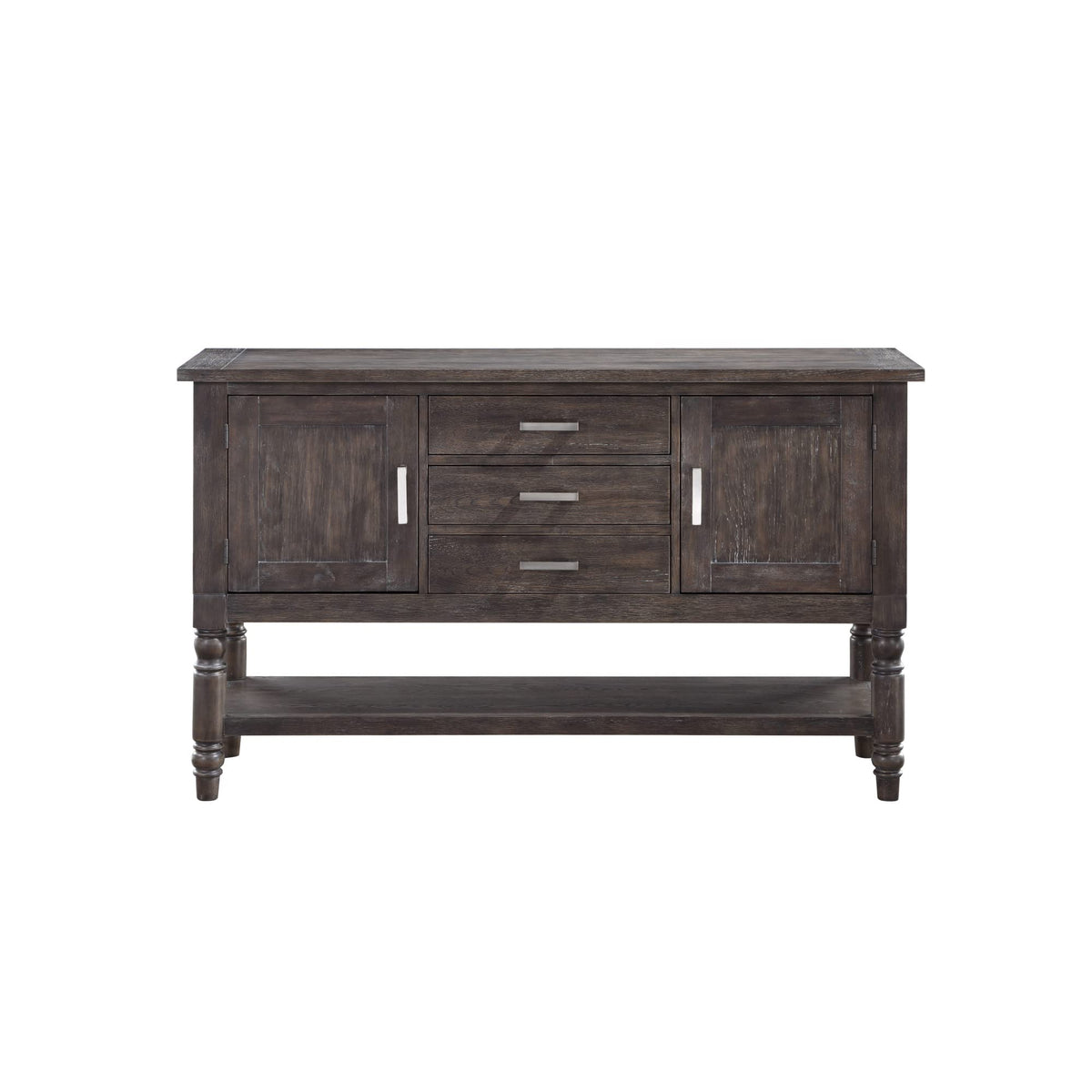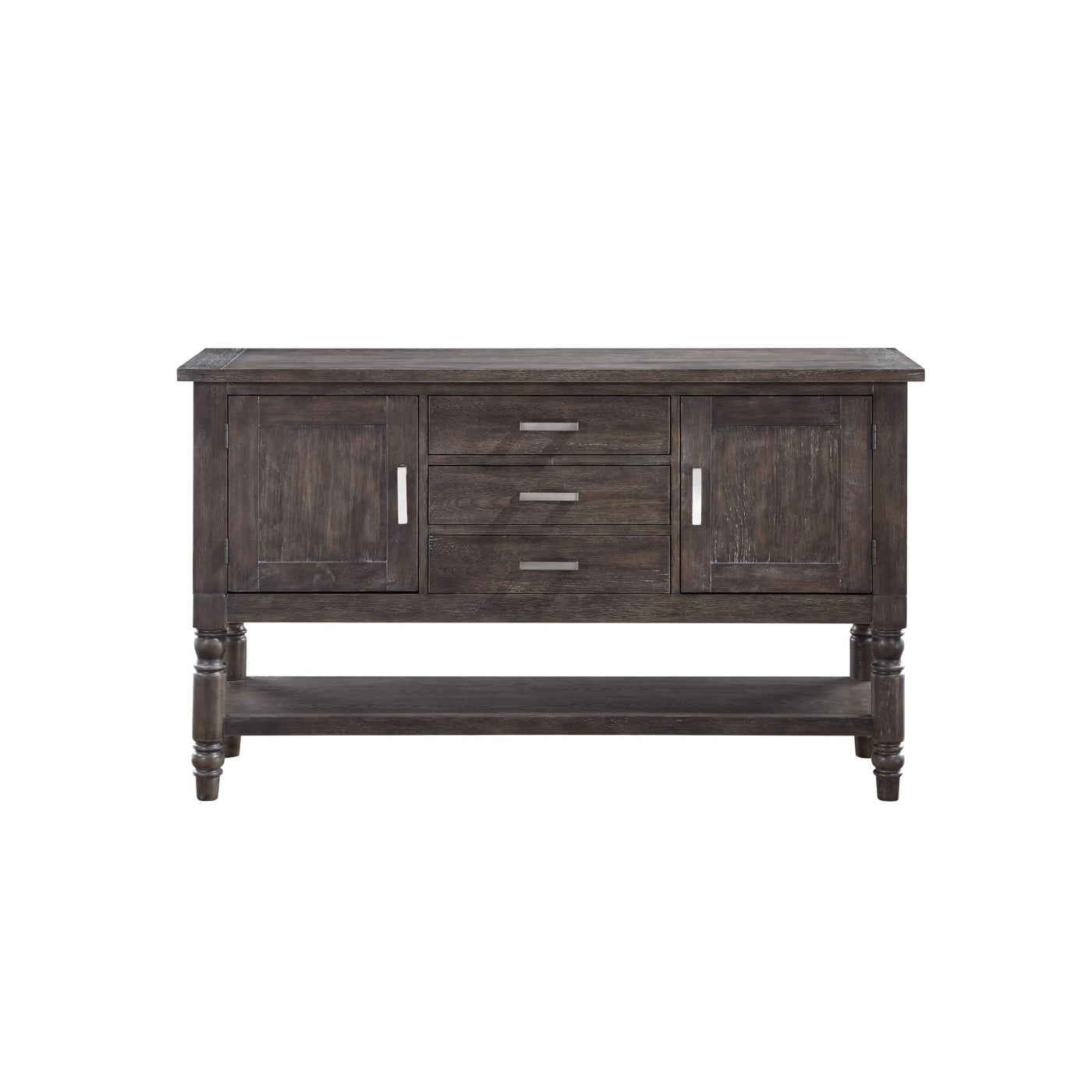 This Server from the Hutchins dining collection adds generous storage and serving area to any dining area. A combination of modern and traditional styling, this piece mixes turned legs with clean lines in an instant classic. Three drawers and two doors add valuable hidden storage and a bottom shelf adds an area for storage or display. This Server, with its dusty charcoal finish and full 60-inch length, will anchor any dining area with elegance and style.
