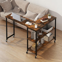 Feature 360°Rotating Tabletop Is Easy To Adjust Its Position To Suit Your Needs Spacious L-Shaped Tabletop Keeps Daily Supplies Easily Accessible Open Shelves For Storing Books, Stationery And Decorations Powder-Coated Metal Frame Is Not Easy To Deform Or Wobble 6 Smooth Rolling Casters Come With Brakes For Added Stability Easy-To-Clean Surface Saves Much Time In Daily Maintenance Round Table Corner Prevents Accidentally Bumps Or Scratches Combines Multipurpose Design With Industrial Aesthetics Suitable For Living Room, Bedroom, Study And Office