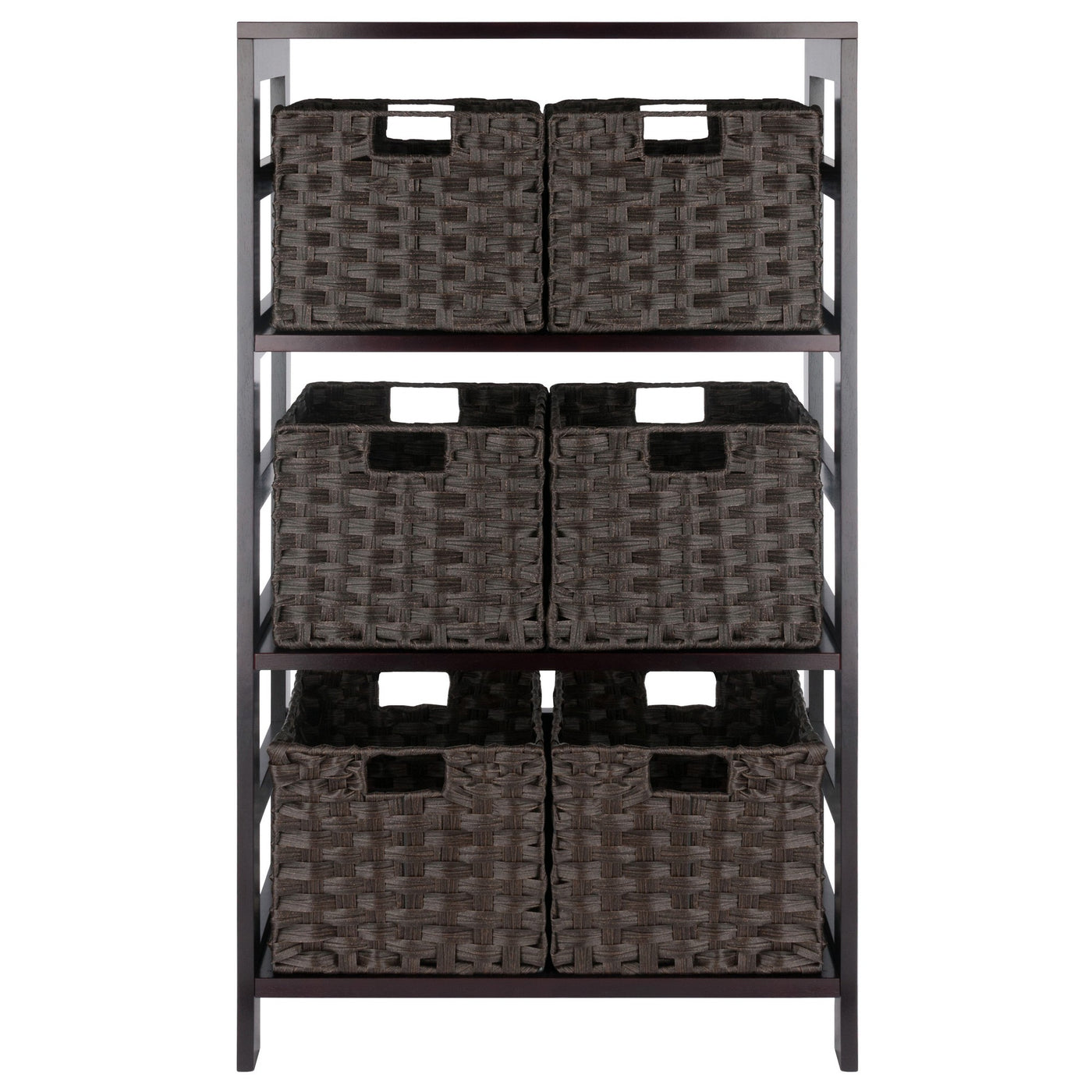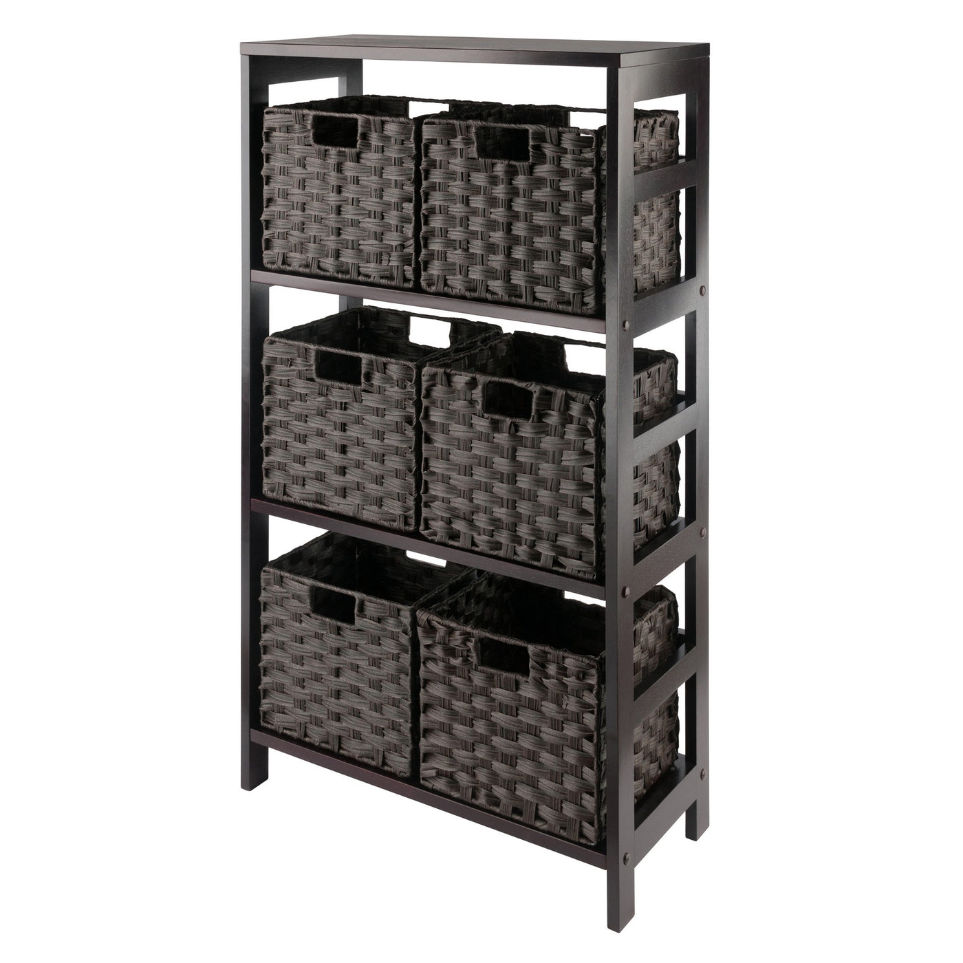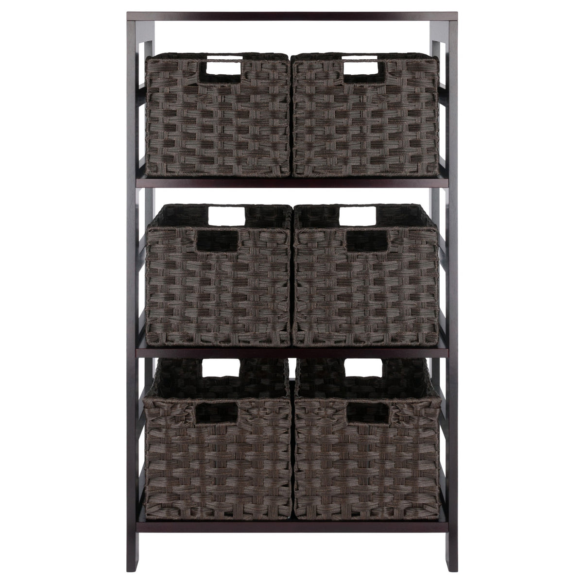Winsome Leo 3-Tier Wide Storage Shelf with 6 Foldable Woven Baskets, for Living Room, Home Office, Bedroom, Espresso