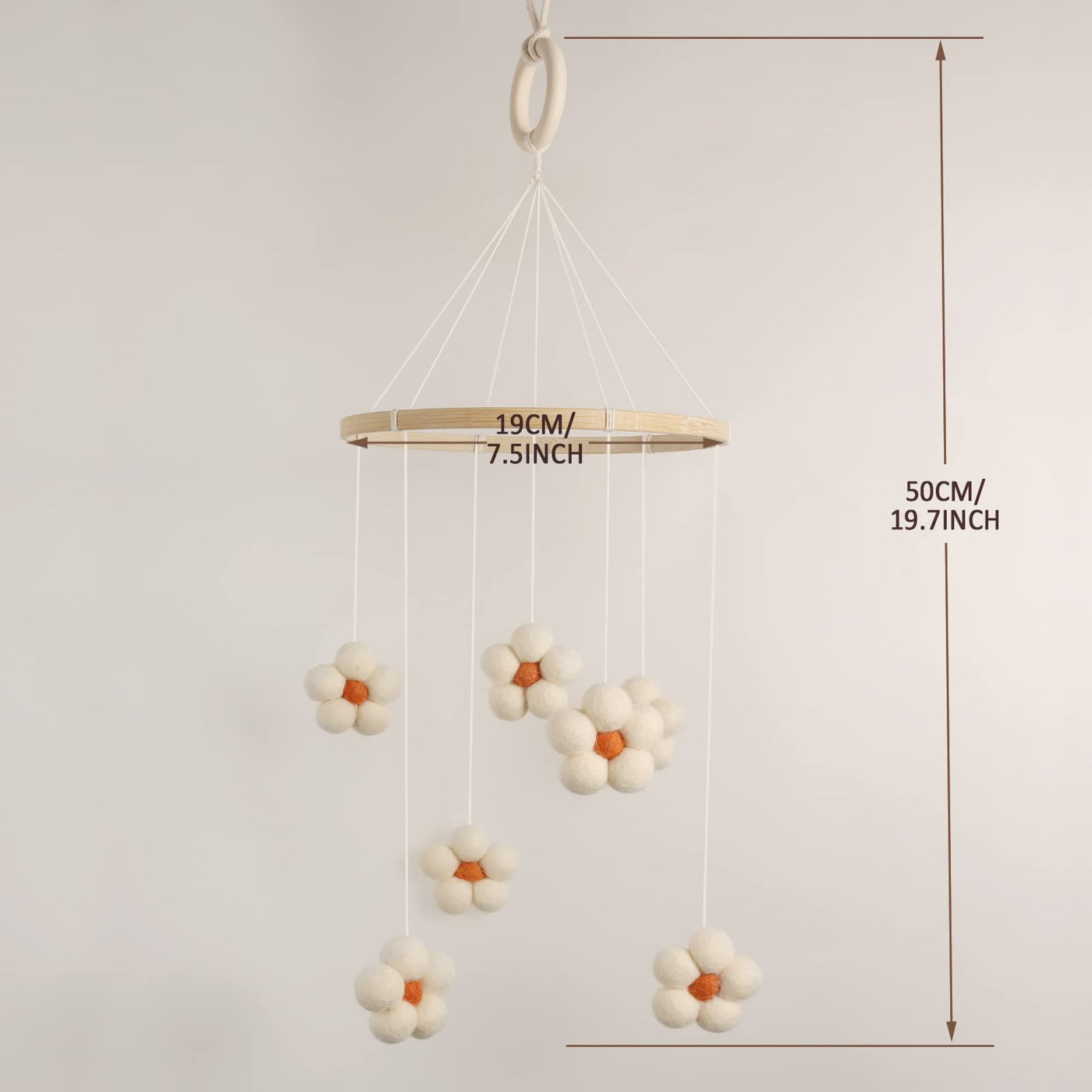 Q: What are the dimensions of the Flower Baby Mobile?A: The mobile has an approximate diameter of 19cm and hangs about 40-50cm from the wooden hoop to the bottom, making it a perfect fit for most cribs and bassinets.