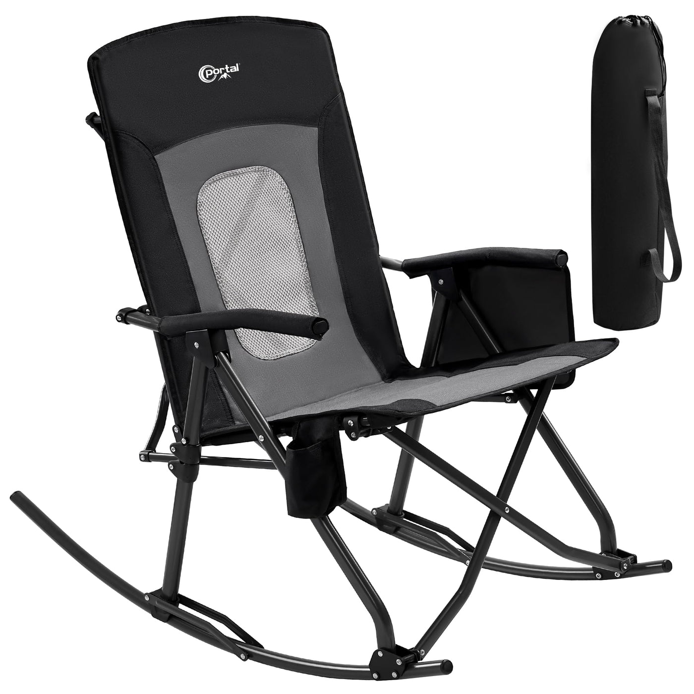 Portal Oversized Folding Rocking Camping Chair Portable Outdoor Rocker With High Back Hard Armrests Carry Bag, Supports 400 Lbs, Mesh Back, Black & Grey