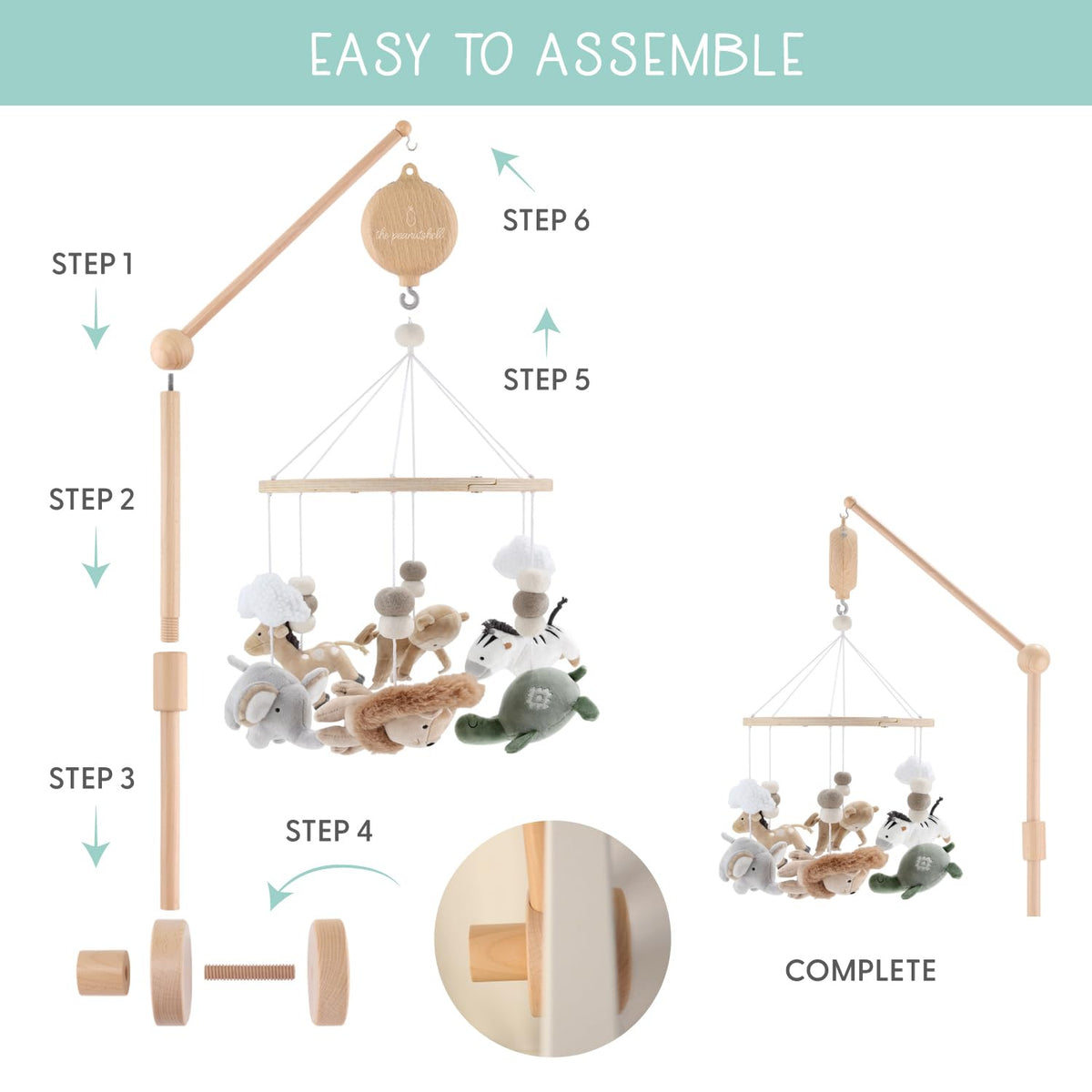 Q: What animals are included in the design of the crib mobile?A: The crib mobile features a delightful array of safari animals including an elephant, giraffe, zebra, monkey, and turtle, bringing a playful jungle theme to your baby's nursery.