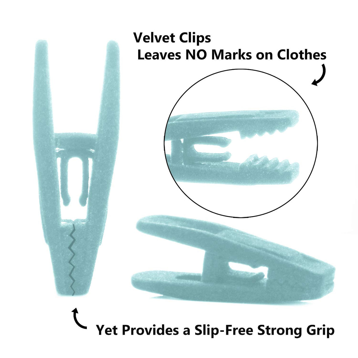 Q: What are the benefits of the matching velvet finger clips included?A: The included velvet finger clips provide a secure grip for hanging pants, jeans, and skirts without leaving marks on the fabric. They are versatile and can be used with most skinny felt hangers.