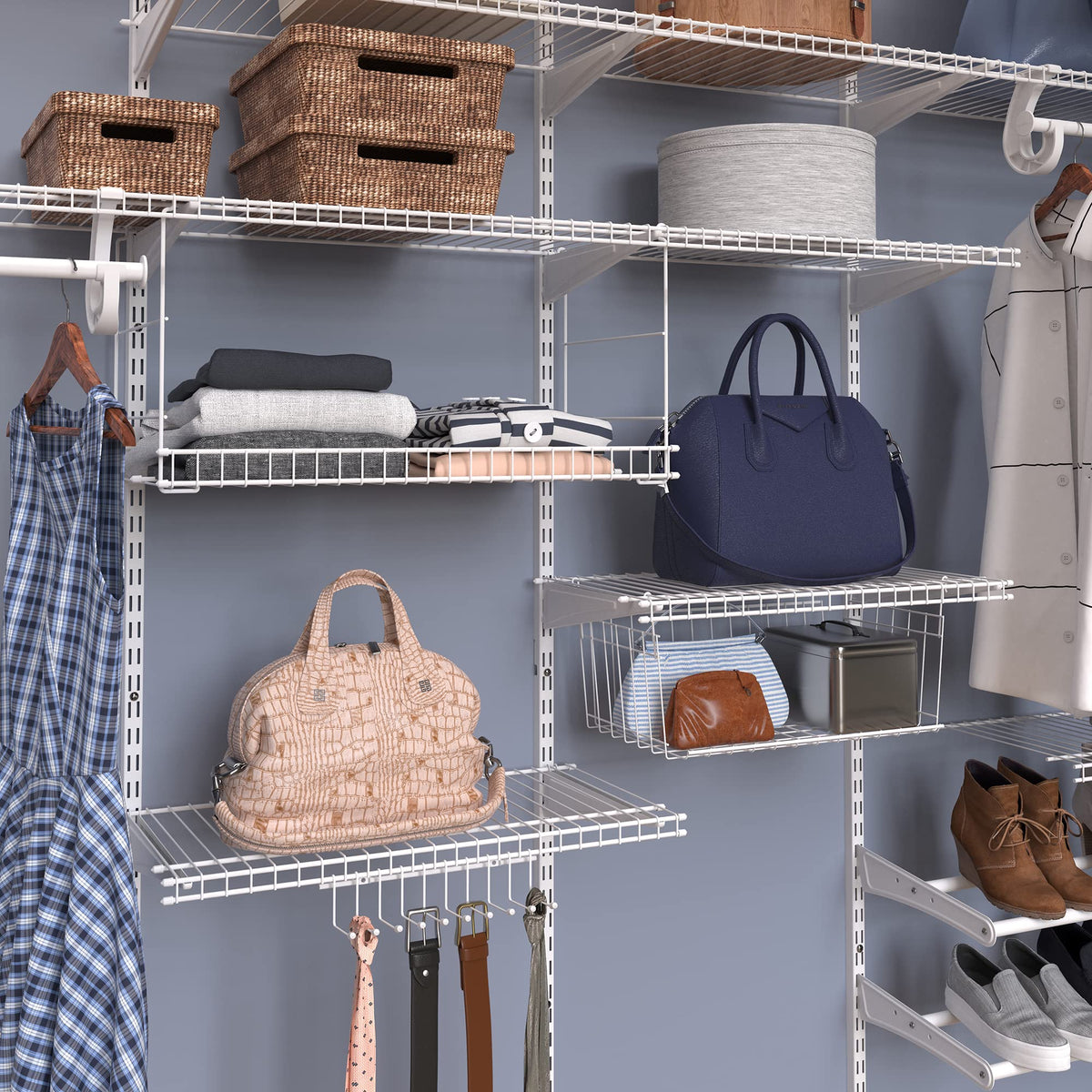 Take Control Of Your Time And Space With The Closetmaid Versatile Tie & Belt Rack! This 10-Hook Rack Is Ideal For Closets, Entryways, Utility Rooms, Laundry Rooms, Bathrooms Or Anywhere In Your Home That Needs Organizing. With 10 Convenient Hooks You Can Easily Hang Belts, Ties, Scarves, Hats Or Jewelry For Easy Access When Youre Getting Dressed. Use In Your Entryway Or Utility Room To Hang Keys, Dog Leashes, Umbrellas Or Other Outdoor Gear To Keep Your Items Organized. With The Wall Mount, Door Mount Or Wire Shelving Attachment Installation Options, This Rack Is Very Versatile! Hardware Is Included To Securely Attach This Organizer Rack To A Wall Or Door With Easy Installation. For Hollow Doors, We Recommend Using Hollow Door Anchors (Sold Separately.) Or You Can Easily Attach To Existing Wire Shelving On The Front As An Add On To Your Existing Shelving System In Your Closet Or Laundry Room. This Lightweight Rack Slides Right Into The Front Of The Wire Shelf For A Quick And Easy Set Up. Use Anywhere That You Have Closetmaid Wire Shelving In Your Home! With The Durable Epoxy Coated Steel Construction, This Product Is Designed For Repeated Use. This Accessory Creates Storage Solutions For Many Places In Your Home.